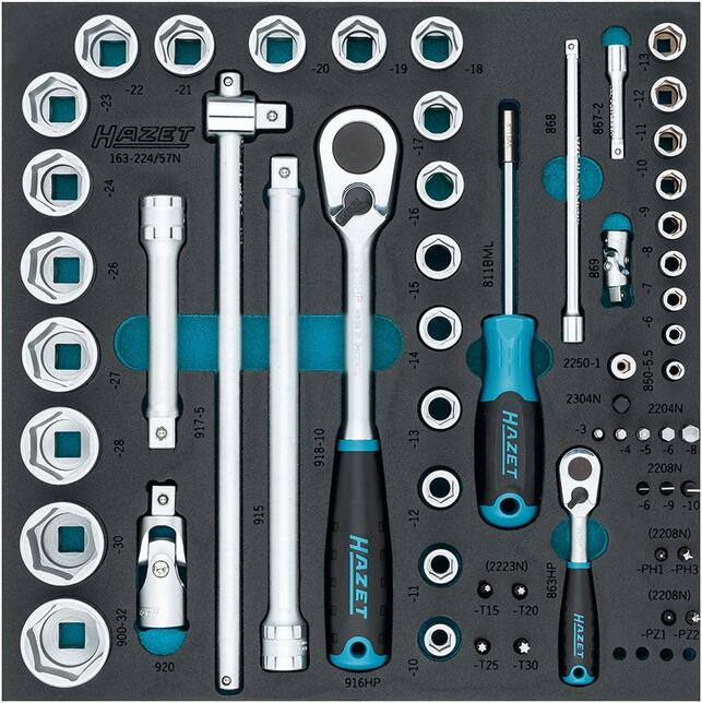 Nástrojový modul nástrčného kľúča 1/4" a 1/2", 57-dielny, modul 2/3 Provedenie: 2farebná penová vložka, tak bude možné okamžite rozpoznať, že nejaké nástroje chýbajú. 1/3 modul = 172 x 342 mm 2/3 modul = 344 x 342 mm 3/3 modul = 519 x 342 mm 3/3+ modul = 519 x 392 mm Upozornenie: Vhodné pre dielenské vozíky a pojazdné pracovné stoly Hazet, pri modeli 179 s použitím distančného modulu. Sada nástrčných kľúčov 1/4" a 1/2", 57 ks 1 prepínacia ráčna 1/4" 9 hlavíc šesťhranných nástrčných kľúčov 1/4" 5,5; 6; 7; 8; 9; 10; 11; 12; 13 mm 2 predĺženia 1/4" 55; 147 mm 1 krížový kĺb 1/4" 1 ručný držiak na bity 1/4" 5 bitov 1/4" vnútorný šesťhran 3; 4; 5; 6; 8 mm 3 bity 1/4" ploché 4,5; 6; 6,5 mm 2 bity 1/4" krížová drážka PH 1; 3 2 bity 1/4" krížová drážka PZ 1; 2 4 bity 1/4" s vnútorným TORX® T 15; 20; 25; 30 1 prepínacia ráčna 1/2" 20 vložiek pre šesťhranné nástrčné kľúče 1/2" 10; 11; 12; 13; 14; 15; 16; 17; 18; 19; 20; 21; 22; 23; 24; 26; 27; 28; 30; 32 mm 1 priečna rukoväť so smýkadlom 1/2" 2 predĺženia 1/2" 123; 248 mm 1 krížový kĺb 1/2" 1 spojovací diel vnútorného štvoreca 1/4" na vnútorný šesťhran 1/4" 1 spojovací diel 1/4" vonkajší šesťhran na 1/4" vonkajší štvorec Výrobca: HAZET-WERK Hermann Zerver GmbH & Co. KG, Güldenwerther Bahnhofstr. 25-29, 42857 Remscheid, DE, +4921917920, info@hazet.de