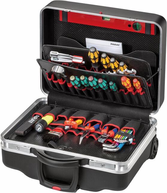 Kufor na náradie s kolieskami CLASSIC KingSize Roll Neo Vyhotovenie: Z robustného, teplotne odolného a nerozbitného plastu X-ABS, odolného proti poškriabaniu, čierny, s pevným stenami na náradie z materiálu Con-Pearl® pre odolnosť proti poškriabaniu, tvarovú stabilitu a odolnosť proti vlhkosti, tukom a chemikáliám a so stabilným teleskopickým výsuvom so 4 polohami s práškovým povrchom v červenej farbe a veľmi širokými pogumovanými kolieskami. Veľmi stabilný vďaka širokému rozvoru kolies. S pozinkovanými a aretovanými kovovými kĺbovými pántami, kufor zaťažiteľný až do 30 kg, dvojitý rám z hliníka. Zamykanie prostredníctvom 2 klopných cylindrických zámkov. Model vhodný na prepravu lietadlom. Dodáva sa bez obsahu. Vybavenie: 25 zásuvnými priehradkami na 2 stranovej doske pre náradie 1 svieracou priehradkou, 400 mm, na obojstrannej doske pre náradie 10 zasúvacími priehradkami na jednostrannej doske pre náradie 15 zasúvacími priehradkami na krycej doske 1 svieracou priehradkou, 400 mm, na krycej doske 1 škrupinou dna s krycou doskou, výška 88 mm, voľne rozdeliteľnou 1 priehradkou na dokumenty vo veku Výrobca: PARAT Solutions GmbH, Gewerbegebiet Manzing 7, 94065 Waldkirchen, DE, +498581999920, info@parat.de