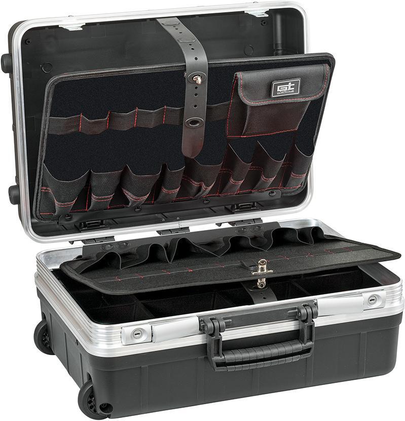 Kufor na náradie s kolieskami REVO 21 WH PTS Vyhotovenie: Z polypropylénu odolného proti nárazom, s vyberateľnými doskami pre náradie odolnými proti opotrebovaniu a stabilným držadlom na prenášanie, zacvakávacou ergonomickou teleskopickou rukoväťou a prepravnými kolieskami s ľahkým chodom. Škrupina dna s výškou 85 mm, voľne rozdeliteľná. Kufor zaťažiteľný až do 25 kg, dvojitý rám z hliníka. Veľmi stabilný. Zamykanie prostredníctvom dvoch klopných cylindrických zámkov. Dodáva sa bez obsahu. Vybavenie: 24 zástrčnými priehradkami na 2 stranovej doske na nástroje 12 prídržnými pútkami na náradie na 1 stranovej doske na nástroje 1 veľkou taškou s uzáverom na obojstrannej doske na náradie 6 zasúvateľnými priehradkami na krycej doske 9 slučkami na krycej doske 1 škrupinou dna s krycou doskou Výrobca: Heinz Hesse KG, Yale-Allee 17, 42329 Wuppertal, DE, +49202734282, info@heinz-hesse-kg.com
