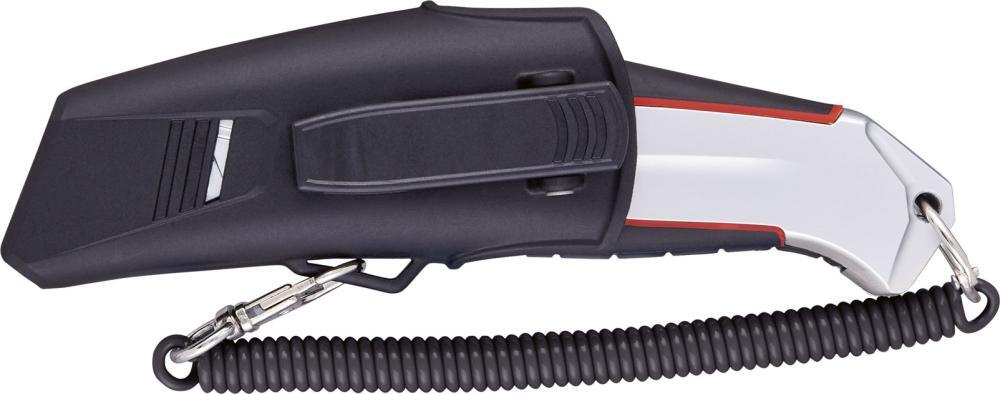 Bezpečnostné nože Vysoká bezpečnosť (automatické zataženie čepele) Pred začatím rezania musíte uvoľniť poistné tlačidlo. Čepel bude po dokončení rezu zatahnutá späť do rukoväte. Puzdro z hliníka s gumovou vložkou a zásobníkom pre ďalšiu čepeľ. Výhodou vloženej keramickej čepele je okrem dlhej životnosti aj nerezavieť, neiskriť, nevodivé a nemagnetické prevedenie. Vďaka špeciálnemu brúsenie čepele je nebezpečenstvo úrazu pri dotyku ostria nižšie. Dodáva sa s 1 keramickou lichobežníkovou čepeľou, puzdrom a spirálovým bezpečnostným pásikom. Výrobca: Einkaufsbüro Deutscher Eisenhändler GmbH, EDE Platz 1, 42389 Wuppertal, DE, +4920260960, webkontakt@ede.de