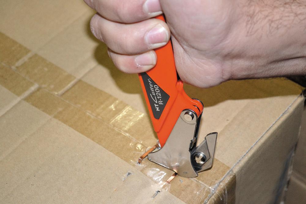 Bezpečnostné otvárače lepenkových krabíc Vyhotovenie: Rukoväť z červeného plastu ABS, ergonomicky tvarovaná. Nôž leží v kovovom držiaku, ktorý chráni obsah balíčka pred neúmyselným poškodením. Výmena britov sa vykonáva prostredníctvom skrutky, puzdro na bity je v rukoväti. Dodáva sa vrátane náhradného britu. Použitie: Na odstránenie balíkových sponiek a rozrezanie viazacej pásky nástrojom. Výrobca: NT Incorporated, , ,