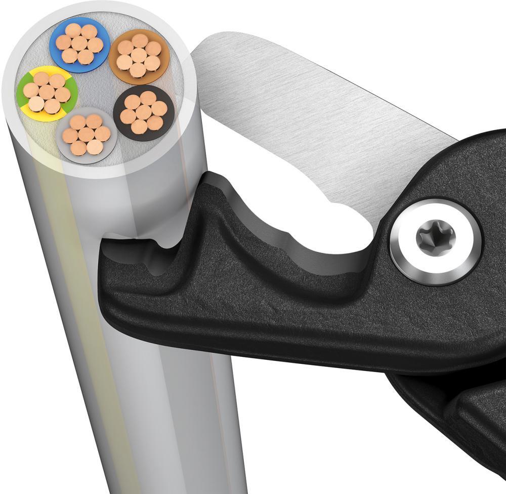 Káblové nožnice StepCut® XL Vyhotovenie: Z kovaných špeciálnych nástrojových vysoko legovaných oceľí, v oleji kalených a popúšťaných. Hlava brynýrovaná, so samočinne zabezpečujúcim nastaviteľným skrutkovým kĺbom a ochranou proti priskrutkovaniu. Tvrdé ostria s precíznym brúsením, jednoduché jednoručné strihanie, hladké, čisté a bez stlačenia. S prípravným a dokončovacím strihom (1. a 2. mm. ostrie) pre rezy v blízkosti kĺbov a pre postupné strihanie veľmi veľkých káblov s odstupňovaním, ktoré udržuje žily v výhodnej polohe. Až o 60 % menšia námaha vďaka zlepšeným pákovým pomerom v porovnaní s normálnymi káblovými nožnicami. Rukoväte s viaczložkovými plastovými návlekmi. Použitie: Na prestrihnutie jednojadrových a viaczložkových medených a hliníkových káblov. Upozornenie: Nie je vhodné pre káble s oceľovou výstužou (ako napr. ACSR). Výrobca: KNIPEX-Werk C. Gustav Putsch KG, Oberkamper Str. 13, 42349 Wuppertal, DE, +4920247940, info@knipex.de