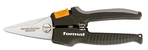 Univerzálne nožnice Vyhotovenie: Čepele z nerezovej ocele, spodná rezacia hrana s vodítkom drôtu, horná rezacia hrana hladká, s odizolovacou čepeľou, pružina pre samočinné otváranie a uzatváracia západka. Rukoväte s ergonomickými plastovými plášťami s vložkami z mäkkej látky. Použitie: Na rezanie všetkých materiálov až po tenké plechy z medi a hliníka, ako aj aranžovacieho drôtu v drôtenom vedení. Mimo to na odizolovanie káblov 1 mm² a 1,5 mm². Nie na oceľ, tvrdené alebo prirodzene tvrdé materiály. Výrobca: Einkaufsbüro Deutscher Eisenhändler GmbH, EDE Platz 1, 42389 Wuppertal, DE, +4920260960, webkontakt@ede.de