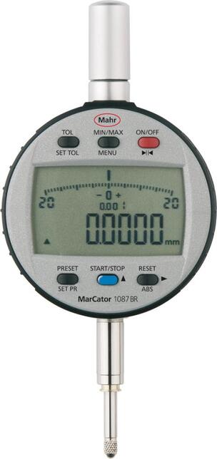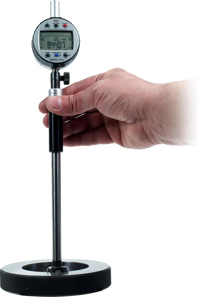 Digitálny úchylkomer s funkciou Integrated Wireless Vyhotovenie: Upínacia stopka a merací čap sú tvrdené, brúsené a z INOX ocele. Výška číslic LCD ukazovateľa 8,5 mm, ovládacia a zobrazovacia časť sa dá otáčať o 280°. S výmenným snímacím hrotom M2,5. Upínacia stopka Ø 8 mm, ochranný uzáver na konci meracieho čapu. S bezdrôtovým dátovým rozhraním RS232, USB a Digimatic. Dodanie s batériou CR2450. Funkcia: Automatické zapnutie, prepínanie mm/palce, blokovanie tlačidla pre nastavenú nulovú polohu, po zapnutí nie je potrebné znovu nastavovať nulu (absolútny systém), pamäť MAX/MIN pre vyhľadávanie bodu obratu, START/STOP vyhľadávanie bodu obratu, zadávanie tolerancie, ABS (prepínanie z relatívneho na absolútne meranie), reset (vynulovanie) je možné aktivovať v každej pozícii, prepínanie smeru počítania, funkcia preset (prednastavenie nameraných hodnôt). Použitie: Bod rovnováhy sa automaticky zistí pomocou kyvadla pri 2-bodovom vnútornom či vonkajšom meraní, potom je možné tomuto bodu ľahko priradiť prednastavenú hodnotu. Pri meraní sa nameraná hodnota uloží do pamäte pomocou funkcie MIN, resp. MAX a zobrazí sa na displeji. Rýchle meracie pohyby s príslušným zabezpečením merania je možné realizovať meraním 64 nameraných hodnôt za sekundu. Výrobca: Mahr GmbH, Carl-Mahr-Str. 1, 37073 Göttingen, DE, +49 551 7073 0, info@mahr.com