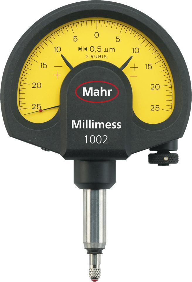 Analógové úchylkomery Vyhotovenie: So špeciálnou ochranou proti nárazu a voľným zdvihom. Všetky pohyblivé diely meracieho mechanizmu sú uložené v kryštáloch. Merací čap a upínacia stopka (Ø 8 mm h6) z odolnej nerezovej ocele, nastaviteľné značky tolerancie, blokovateľné jemné nastavenie. Výrobca: Mahr GmbH, Carl-Mahr-Str. 1, 37073 Göttingen, DE, +49 551 7073 0, info@mahr.com