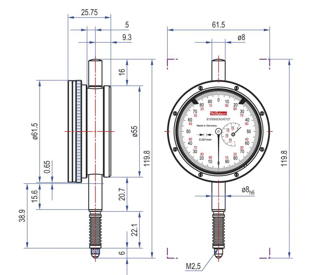 Analógový úchylkomer, olejotesný a vodotesný Vyhotovenie: Ochrana proti nárazu, merací čap a upínacia stopka (Ø 8 mm h6) sú z odolnej nerezovej ocele, merací čap je leštený. Precízne vedené puzdro nad meracím čapom je umiestnené a odpružené takým spôsobom, že sa náraz nepřenáša na mechanizmus úchylkomera. S gumovým mechom na meracom čape a krúžkovým tesnením na stupnici a zadnej stene za účelom ochrany proti účinkom kvapalín a nečistôt. Výrobca: Käfer Meßuhrenfabrik GmbH & Co. KG, Hahnstr. 11, 78054 Villingen-Schwenningen, DE, +49772083410, info@kaefer-messuhren.de