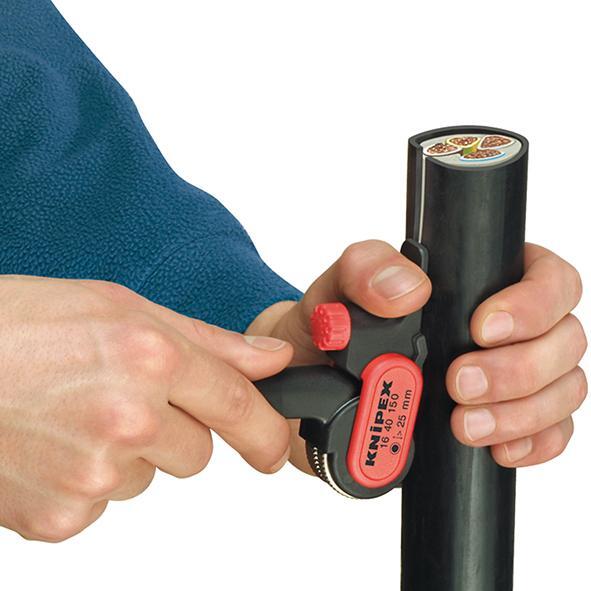Odplášťovací nôž Provedenie: Telo z plastu s laminátovou výstuhou. Hĺbku rezu je možné nastaviť ryhovacím skrutkou až do hrúbky izolácie 5 mm. S výmennou čepeľou, obojstranne použiteľnou. Použitie: Na odplášťovanie káblov s guľatým prierezom. Odstránenie všetkých izolačných vrstiev. Vhodný na pozdĺžne a obrezávacie rezy. Výrobca: KNIPEX-Werk C. Gustav Putsch KG, Oberkamper Str. 13, 42349 Wuppertal, DE, +4920247940, info@knipex.de