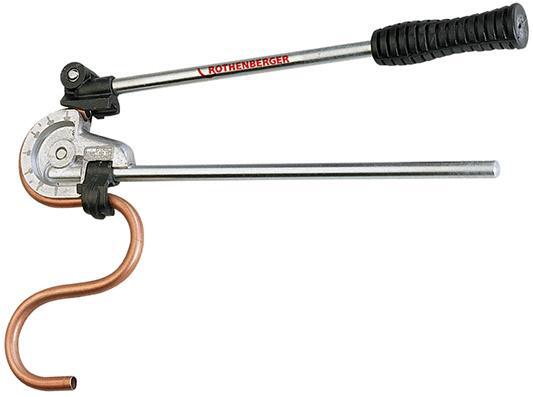 Kliešte na ohýbanie rúr Vyhotovenie: Ľahká konštrukcia s jedným pevným a jedným pohyblivým ohýbacím ramenom. Ukazovateľ polomeru ohybu s delením v stupňoch 0–180° v krokoch po 30° a upínacím prípravkom pre lepšie držanie rúrky. Pohyblivé ohýbacie rameno s plastovou rukoväťou. Použitie: Pre presné ohýbanie oboma rukami až do uhla 180° mäkkých medených, hliníkových a oceľových rúr. Taktiež vhodné pre ohýbanie extra krátkych rúr. Výrobca: ROTHENBERGER Werkzeuge GmbH, Industriestrasse 7, 65779 Kelkheim, DE, +4961958001, info@rothenberger.com