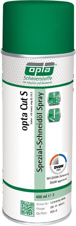 Rezací olej opta Cut S DVGW v spreji Vyhotovenie: Syntetický, bez chlóru, testovaný podľa DVGW. Použitie: Pre obrábanie ocele a ušľachtilej ocele. Špeciálne vhodné na rezanie závitov a pílenie na zariadeniach pitnej vody a sanitárnych zariadeniach. Výrobca: FUCHS LUBRICANTS GERMANY GmbH, Friesenheimer Str. 19, 68169 Mannheim, DE, +49421549030, info@fuchs-wisura.de
