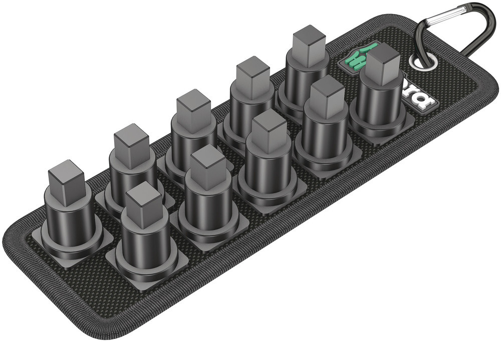 1 robustný textilný pás, neosadený. Až pre 10 nástrčných hlavíc (ořechů) alebo zástrčné nástavce VDE so 3/8" štvorkom. Vrátane karabinového háku na pripevnenie na pútko opasku alebo kapsy. Zadná časť z rouna a suchý zips pre jednoduché pripevnenie napr. na stenu, regál, dielenský vozík a prepravný systém náradia Wera 2go. Ľahko chodiaci otáčavý mechanizmus pre bezpečné uchovávanie a jednoduché vybratie náradia.