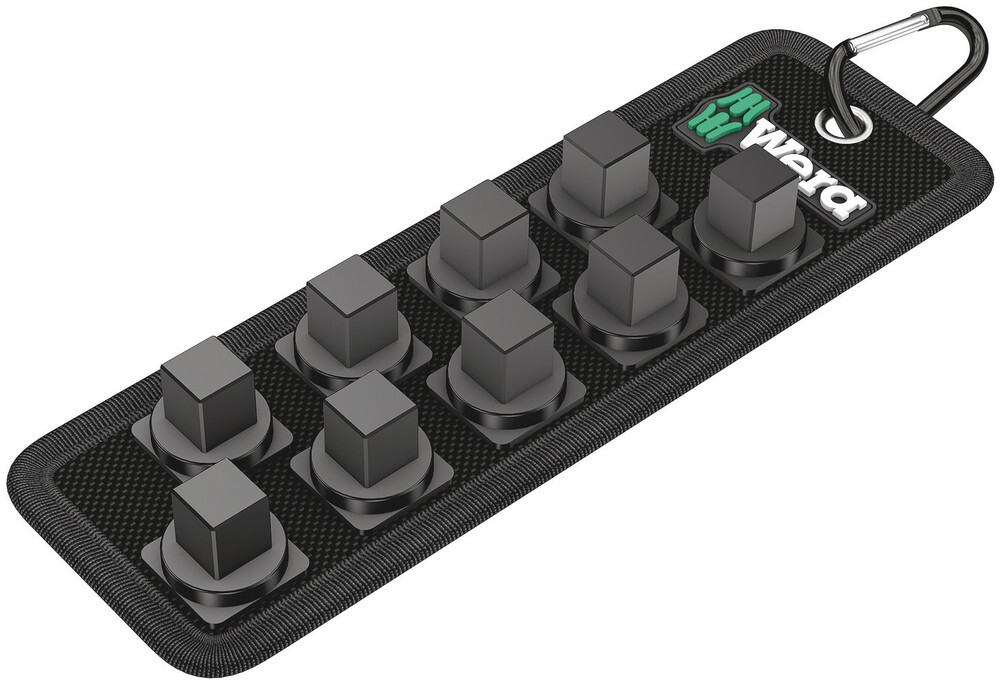 1 robustný textilný pás, neosadený. Pre až 9 nástrčných hlavíc (ořechů) alebo zástrčné nástavce s bitom so 1/2" štvorkom. Vrátane karabinového háku na pripevnenie na pútko opasku alebo kapsy. Zadná časť z rouna a suchý zips pre jednoduché pripevnenie napr. na stenu, regál, dielenský vozík a prepravný systém náradia Wera 2go. Ľahko chodiaci otáčavý mechanizmus pre bezpečné uchovávanie a jednoduché vybratie náradia.
