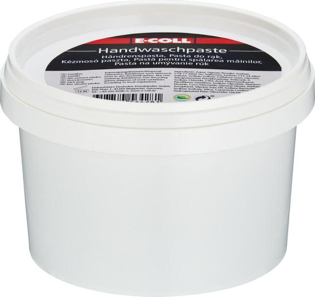 Pasta na umývanie rúk Provedenie: Pasta na umývanie rúk bez obsahu piesku, premasťuje pokožku. Bez fosfátov a biologicky odbúrateľná. Kombinácia jemných tenzidov, ktoré nedráždia (=detergentné látky), a ošetrujúcich a organických trených prostriedkov. Jemný granulát z mäkkého dreva krychlového tvaru uľahčuje odtokové potrubia. Použitie: Používa sa predovšetkým na stredné až intenzívne znečistenie rúk stavebným materiálom, riediteľným vodou na tukovej a pigmentovej báze. Výrobca: Einkaufsbüro Deutscher Eisenhändler GmbH, EDE Platz 1, 42389 Wuppertal, DE, +4920260960, webkontakt@ede.de
