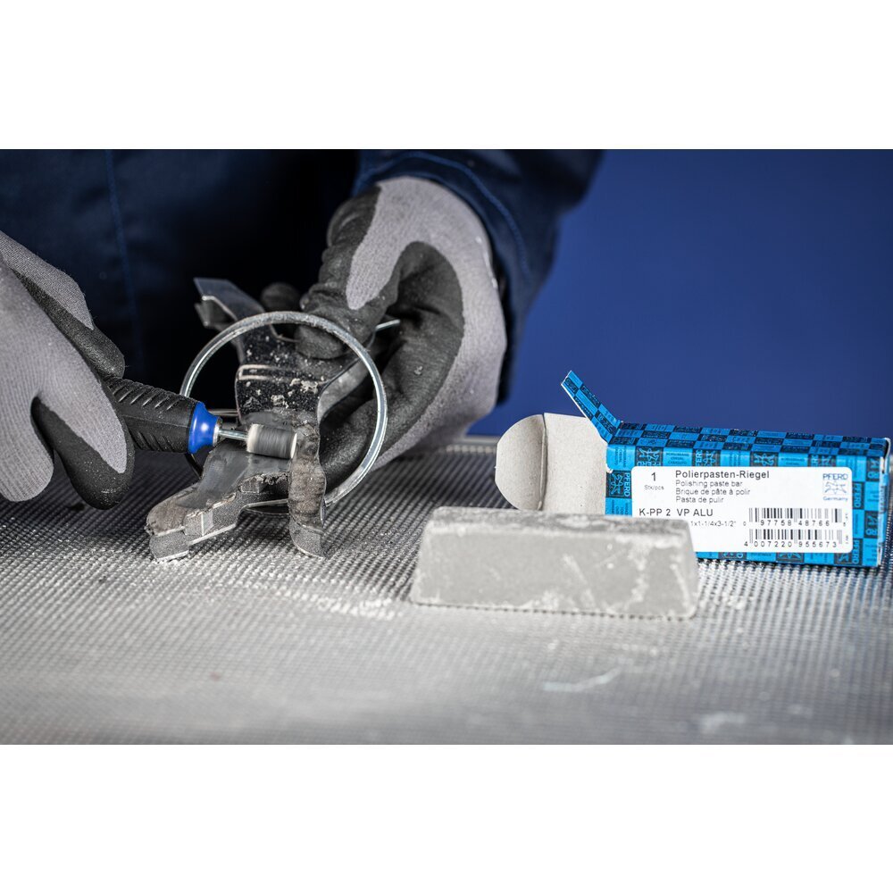 Okrem použitia s plstenými nástrojmi sa leštiace pasty používajú aj v kombinácii s látkovými krúžkami na predleštenie a leštenie s vysokým leskom. Ak je cieľom dosiahnuť veľmi hladké povrchové úpravy, použite niekoľko alebo dokonca všetky varianty po sebe. Tyčinky leštiacej pasty sú k dispozícii v malom balení a vo veľkom balení. Typ ALU je vhodný na hrubé predleštenie s sisalovou látkou (ST) a predleštenie s tvrdou látkou (TH).
