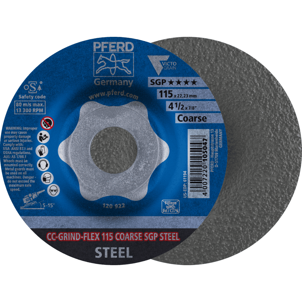 Nástroje špeciálnej línie SGP sú špeciálne vyvinuté pre konkrétne úlohy a ponúkajú používateľovi kľúčové výhody oproti konvenčným produktom. Okrem toho špeciálna línia SGP zahŕňa nástroje, ktoré ponúkajú maximálnu ekonomickú efektívnosť vďaka svojej mimoriadne vysokej výkonnosti počas používania. CC-GRIND FLEX je poloh flexibilný doplnok k CC-GRIND SOLID. Bol vyvinutý najmä na prácu na zvarových švoch. Zvarové spoje môžu byť úplne vyhladené. To znamená, že hrboly a preliačiny – najmä tie, ktoré sú viditeľné po natieraní alebo lakovaní – sú minulosťou. Poloh flexibilný brúsny kotúč s presne tvarovaným, uhlovým vysokovýkonným abrazívnym zrnkom VICTOGRAIN pre oceľ s maximálnym brúsnym výkonom a vynikajúcou životnosťou nástroja. Produkty VICTOGRAIN sú jedny z najúčinnejších brúsnych nástrojov na svete. Trojuholníkové, presne tvarované abrazívne zrno od PFERD TOOLS pomáha zabezpečiť jedinečne vysokú úroveň abrazívneho výkonu. Trojuholníky abrazívneho zrna VICTOGRAIN sú identické vo forme a veľkosti a ich rezné hrany sú aplikované na obrobok pod optimálnym uhlom, čo znamená, že zrno potrebuje veľmi málo energie na prenikanie do obrobku. Používateľ tak ťaží z efektívneho obrábacieho procesu s rýchlym pokrokom v práci, dlhou životnosťou nástroja, zníženým prítokom tepla do obrobku a nižším výkonom potrebným pre pohon nástroja.;Trojuholníky abrazívneho zrna VICTOGRAIN sú na substráte upevnené na jednej strane. To znamená, že sú bezpečne upevnené na mieste a spolu so svojím štíhlym dizajnom ponúkajú mimoriadne veľký priestor na triesky, aby sa ďalej zlepšila efektívnosť obrábania. Štruktúra trojuholníkového VICTOGRAIN bola tiež špeciálne prispôsobená na maximalizáciu výsledkov. Veľmi malé kryštály vo vnútri trojuholníkov zabezpečujú optimálne vlastnosti opotrebenia, pretože ostré rezné hrany sú vždy vystavené, ale len minimálne množstvo abrazívneho zrna/trojuholník sa odlomí. Kombinovaním všetkých týchto vlastností majú používatelia prospech z optimálneho, konštantného výkonu počas chladeného brúsenia a mimoriadne dlhej životnosti nástroja spolu s konzistentnou drsnosťou povrchu obrobku.