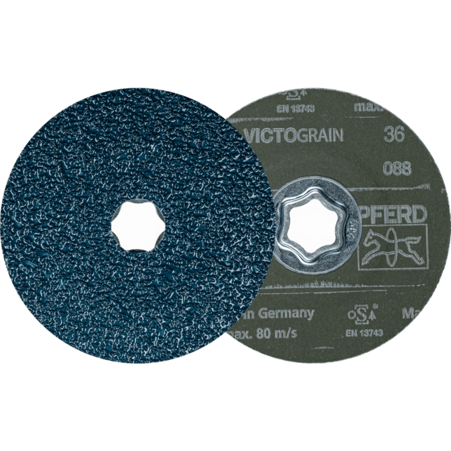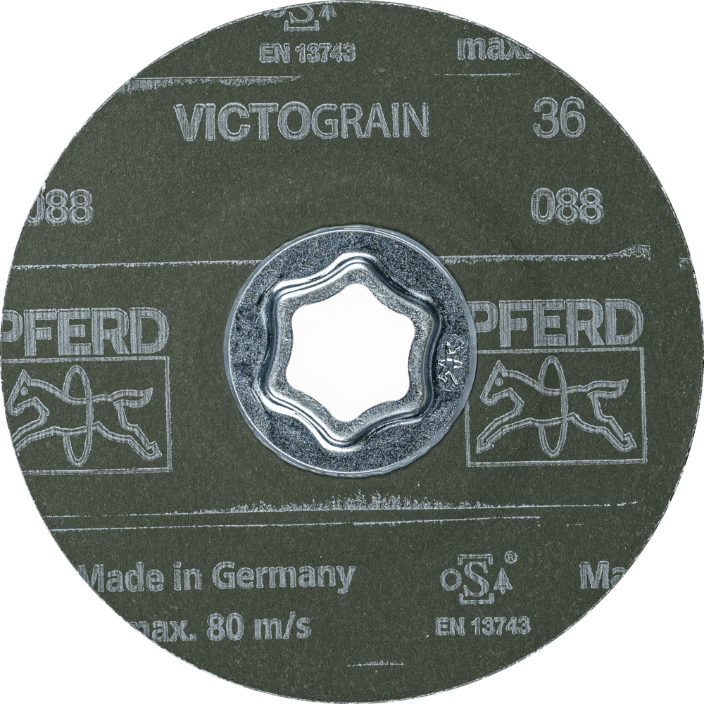 Systém COMBICLICK pozostáva z špeciálne vyvinutého podložného disku a robustného montážneho systému na zadnej strane náradia. S podložným diskom môžu byť náradia COMBICLICK používané na komerčne dostupných uhlových brúskach. Jedinečná geometria chladiacich otvorov zabezpečuje vysoký prietok vzduchu, čo výrazne znižuje tepelnú záťaž na abrazívny materiál a obrobok. V porovnaní s konvenčnými náradiami dosahuje rýchlomontážny systém, robustný držiak, bezpečnostný zámok náradia a integrovaný chladiaci systém spolu teplotu obrobku, ktorá je o 30 % nižšia, o 25 % vyššiu rýchlosť odstraňovania materiálu, o 30 % dlhšiu životnosť náradia a lepšie využitie abrazívneho materiálu. Vlnené disky PFERD TOOLS sú vyrábané v súlade s ISO 16057 v tvare A1 verzia F pod označením "vulkanizovaný vlnený disk". Pre maximálne agresívne brúsenie s extrémne dlhou životnosťou náradia a vynikajúcou rýchlosťou odstraňovania materiálu na oceľ a tvrdé materiály. Vynikajúci, konštantne vysoký výkon vďaka abrazívnemu zrna VICTOGRAIN. Abrazívne trojuholníky VICTOGRAIN sú pripevnené k substrátu na jednej strane. To znamená, že sú bezpečne upevnené a spolu so svojím štíhlym dizajnom ponúkajú extrémne veľký priestor na triesky, aby sa ďalej zlepšila efektivita obrábania. Štruktúra trojuholníkového VICTOGRAIN bola tiež špeciálne prispôsobená na maximalizáciu výsledkov. Veľmi malé kryštály vo vnútri trojuholníkov zabezpečujú optimálne vlastnosti opotrebenia, pretože ostré rezné hrany sú vždy vystavené, ale len minimálne množstvo abrazívneho zrna/trojuholník sa odlomí. Kombinovaním všetkých týchto vlastností majú používatelia prospech z konečného, konštantného výkonu počas chladného brúsenia a extrémne dlhého životnosti náradia spolu s konzistentnou drsnosťou povrchu obrobku.