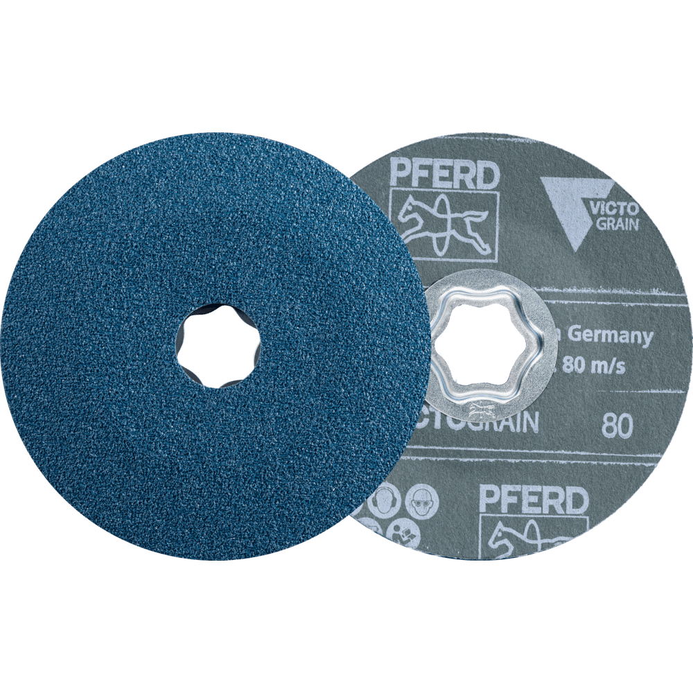 Systém COMBICLICK pozostáva z špeciálne vyvinutého podložného disku a robustného montážneho systému na zadnej strane náradia. S podložným diskom môžu byť náradia COMBICLICK používané na komerčne dostupných uhlových brúskach. Jedinečná geometria chladenia zabezpečuje vysoký prietok vzduchu, čo výrazne znižuje tepelnú záťaž na abrazívny materiál a obrobok. V porovnaní s konvenčnými náradiami dosahuje rýchlomontážny systém, robustný držiak, bezpečnostný zámok náradia a integrovaný chladicí systém spolu teplotu obrobku, ktorá je o 30 % nižšia, o 25 % vyššiu rýchlosť odoberania materiálu, o 30 % dlhšiu životnosť náradia a lepšie využitie abrazívneho materiálu. Vlákna PFERD TOOLS sú vyrábané v súlade s ISO 16057 v tvare A1 verzia F pod označením "vulkanizovaný vláknový disk". Pre maximálne agresívne brúsenie s extrémne dlhou životnosťou náradia a vynikajúcou rýchlosťou odoberania materiálu na oceľ a tvrdé materiály. Vynikajúci, konštantný vysoký výkon vďaka abrazívnemu zrnku VICTOGRAIN. Abrazívne trojuholníky VICTOGRAIN sú upevnené na substráte na jednej strane. To znamená, že sú bezpečne upevnené a spolu so svojím štíhlym dizajnom ponúkajú extrémne veľký priestor na triesky, aby sa ďalej zlepšila efektivita obrábania. Štruktúra trojuholníkového VICTOGRAIN bola tiež špeciálne prispôsobená na maximalizáciu výsledkov. Veľmi malé kryštály vo vnútri trojuholníkov zabezpečujú optimálne vlastnosti opotrebenia, pretože ostré rezné hrany sú vždy vystavené, ale iba minimálne množstvo abrazívneho zrna/trojuholník sa odlomí. Kombinovaním všetkých týchto vlastností majú používatelia prospech z konečného, konštantného výkonu počas chladného brúsenia a extrémne dlhého životnosti náradia spolu s konzistentnou drsnosťou povrchu obrobku.