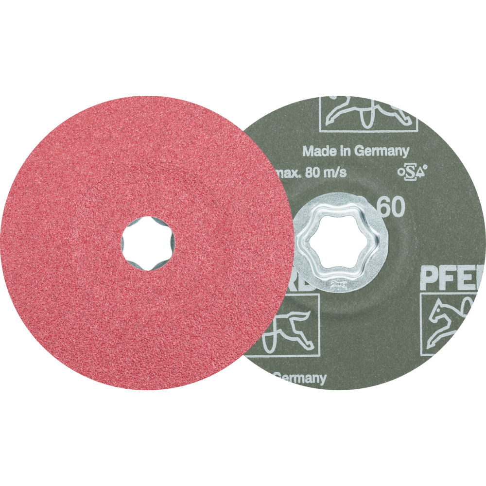 Systém COMBICLICK pozostáva z špeciálne vyvinutého podložného disku a robustného montážneho systému na zadnej strane náradia. S podložným diskom môžu byť náradia COMBICLICK používané na komerčne dostupných uhlových brúskach. Jedinečná geometria chladenia zabezpečuje vysoký prietok vzduchu, čo výrazne znižuje tepelnú záťaž na abrazívny materiál a obrobok. V porovnaní s konvenčnými náradiami dosahuje rýchlomontážny systém, robustný držiak, bezpečnostný zámok náradia a integrovaný chladicí systém spolu teplotu obrobku, ktorá je o 30 % nižšia, o 25 % vyššiu rýchlosť odstraňovania materiálu, o 30 % dlhšiu životnosť náradia a lepšie využitie abrazívneho materiálu. Vlákna PFERD TOOLS sú vyrábané v súlade s ISO 16057 v tvare A1 verzia F pod označením "vulkanizovaný vláknový disk". Pre agresívne brúsenie s maximálnou rýchlosťou odstraňovania materiálu a veľmi dlhou životnosťou náradia. Keramické oxidačné zrno je špeciálne navrhnuté na prácu s tvrdými materiálmi a vrstvami.