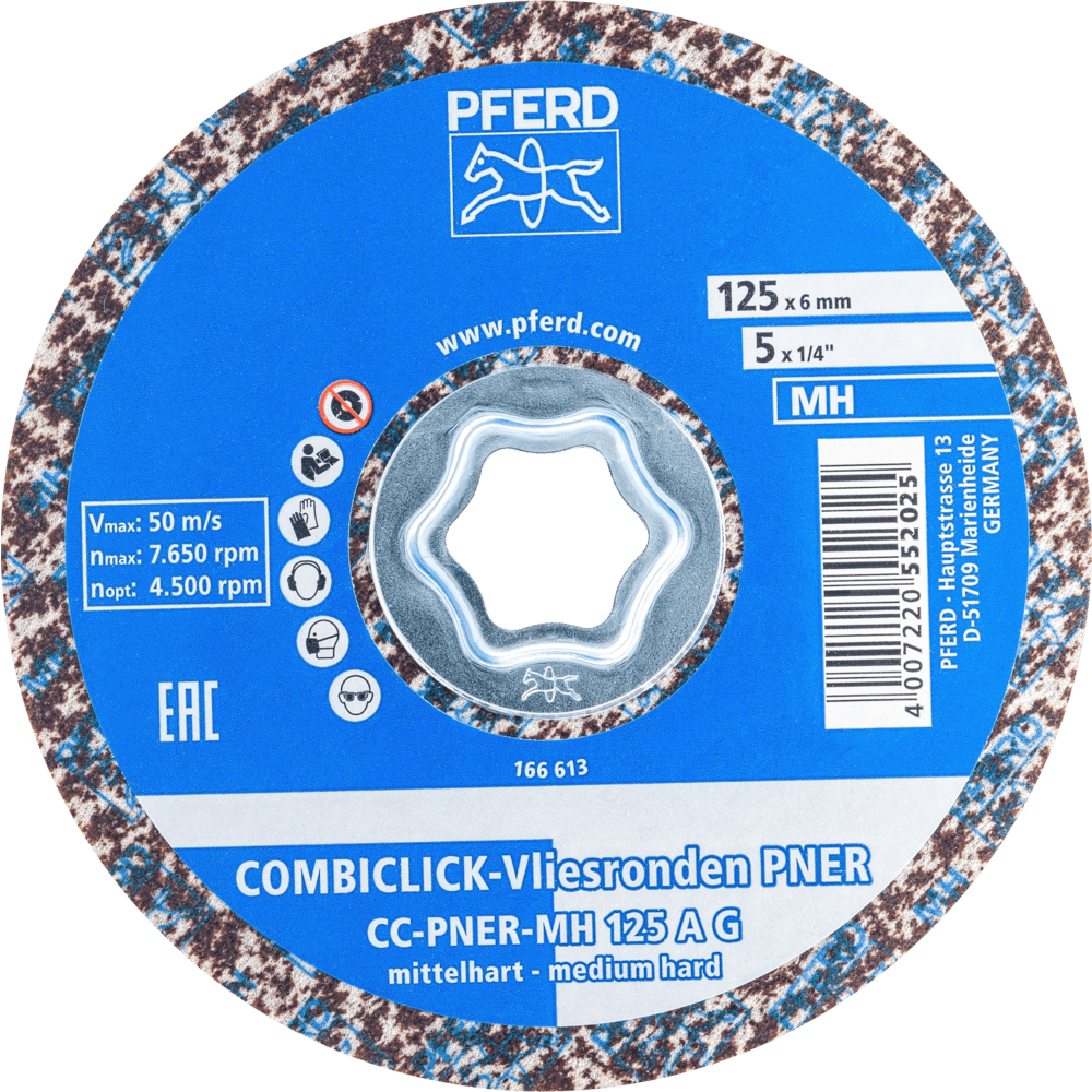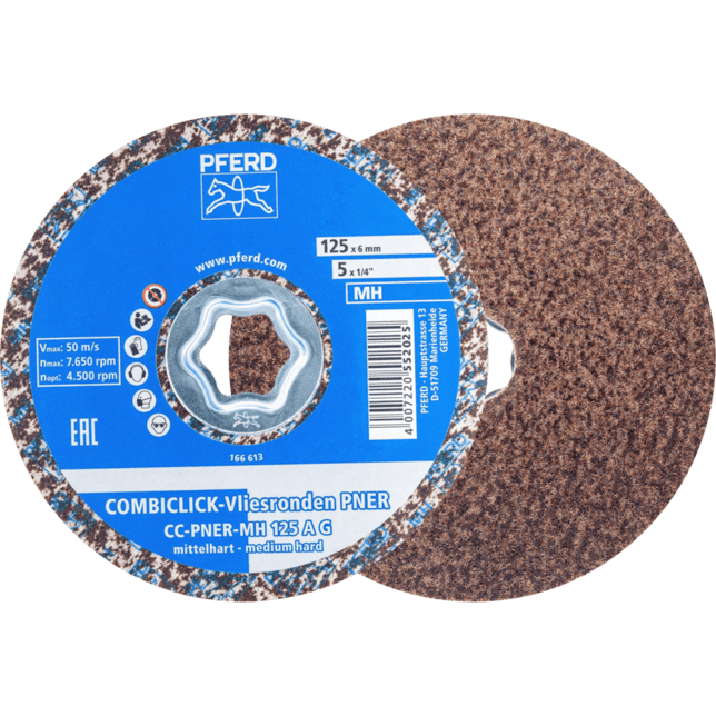 Systém COMBICLICK pozostáva z špeciálne vyvinutého podložného disku a robustného montážneho systému na zadnej strane náradia. S podložným diskom môžu byť náradia COMBICLICK používané na komerčne dostupných uhlových brúskach. Jedinečná geometria chladenia zabezpečuje vysoký prietok vzduchu, čo výrazne znižuje tepelnú záťaž na abrazívny materiál a obrobok. V porovnaní s konvenčnými náradiami dosahuje rýchloupínací systém, robustný držiak, bezpečnostný zámok náradia a integrovaný chladicí systém spolu teplotu obrobku, ktorá je o 30 % nižšia, o 25 % vyššiu rýchlosť odstraňovania materiálu, o 30 % dlhšiu životnosť náradia a lepšie využitie abrazívneho materiálu. Na dosiahnutie veľmi jemného, rovnomerného povrchového úpravy, ktorá, v závislosti od požiadaviek, je dostatočnou prípravou na vysokolesklé leštenie. Obzvlášť vhodné na prácu na väčších plochách na komponentoch vyrobených z nehrdzavejúcej ocele (INOX).