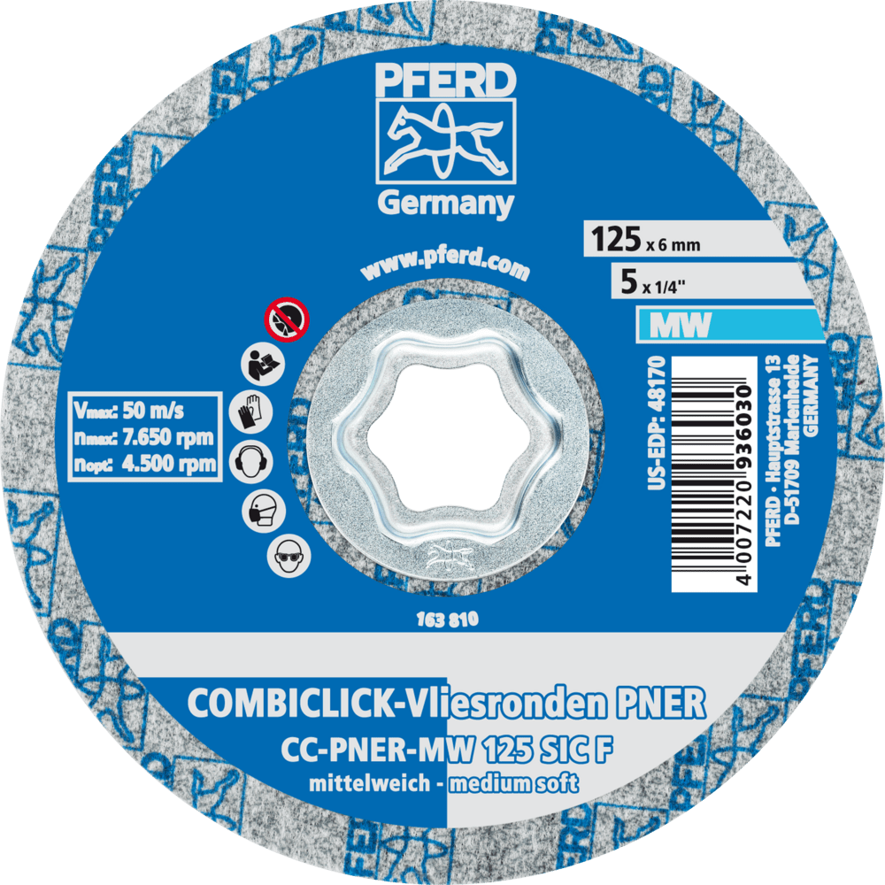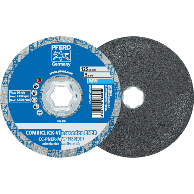 Systém COMBICLICK pozostáva z špeciálne vyvinutého podložného disku a robustného montážneho systému na zadnej strane náradia. S podložným diskom môžu byť nástroje COMBICLICK používané na komerčne dostupných uhlových brúskach. Jedinečná geometria chladenia zabezpečuje vysoký prietok vzduchu, čo výrazne znižuje tepelnú záťaž na abrazívny materiál a obrobok. V porovnaní s konvenčnými nástrojmi dosahuje rýchlosť montáže, robustný držiak, bezpečnostný zámok náradia a integrovaný chladicí systém spolu teplotu obrobku, ktorá je o 30 % nižšia, o 25 % vyššiu rýchlosť odstraňovania materiálu, o 30 % dlhšiu životnosť náradia a lepšie využitie abrazívneho materiálu. Tento dizajn je ideálny na dosiahnutie veľmi jemného, rovnomerného povrchového dokončenia, ktoré je v závislosti od požiadaviek dostatočnou prípravou na vysokolesklé leštenie. Je obzvlášť vhodný na prácu na väčších plochách komponentov vyrobených z nehrdzavejúcej ocele (INOX).