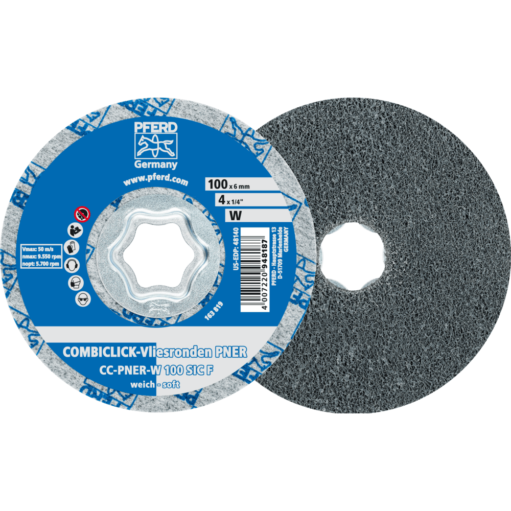 Systém COMBICLICK pozostáva z špeciálne vyvinutého podložného disku a robustného montážneho systému na zadnej strane náradia. S podložným diskom môžu byť náradia COMBICLICK používané na komerčne dostupných uhlových brúskach. Jedinečná geometria chladiacich otvorov zabezpečuje vysoký prietok vzduchu, čo výrazne znižuje tepelnú záťaž na abrazívny materiál a obrobok. V porovnaní s konvenčnými náradiami dosahuje rýchloupínací systém, robustný držiak, bezpečnostný zámok náradia a integrovaný chladiaci systém spolu teplotu obrobku, ktorá je o 30 % nižšia, o 25 % vyššiu rýchlosť odstraňovania materiálu, o 30 % dlhšiu životnosť náradia a lepšie využitie abrazívneho materiálu. Tento dizajn je ideálny na dosiahnutie veľmi jemného, rovnomerného povrchového dokončenia, ktoré, v závislosti od požiadaviek, predstavuje dostatočnú prípravu na vysokolesklé leštenie. Je obzvlášť vhodný na prácu na väčších plochách komponentov vyrobených z nehrdzavejúcej ocele (INOX).