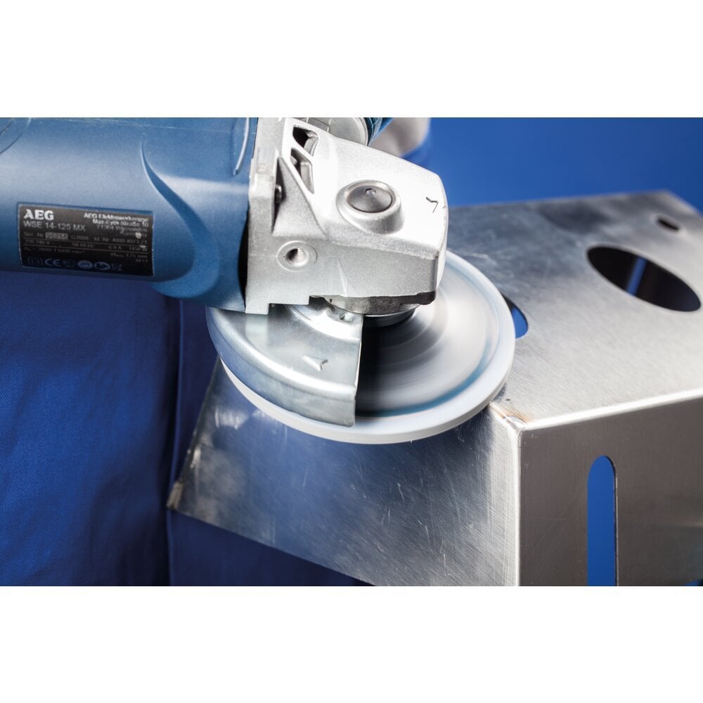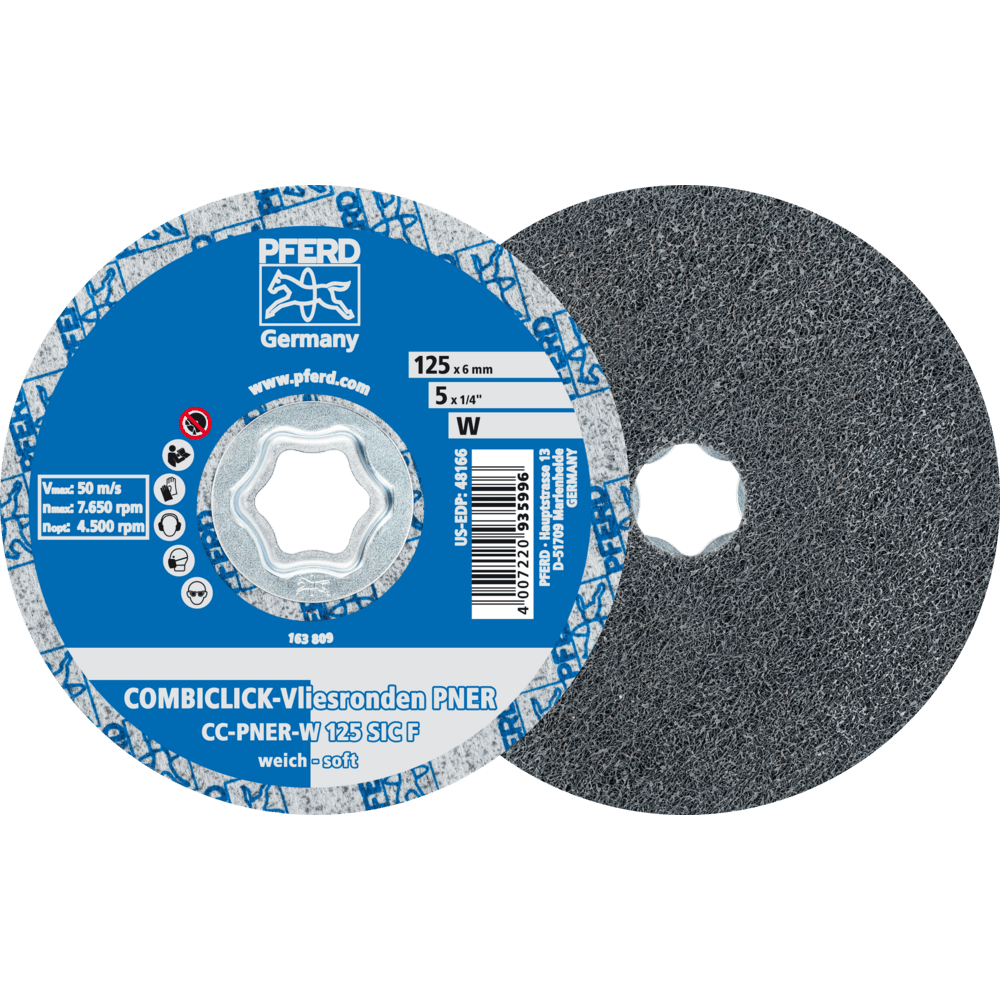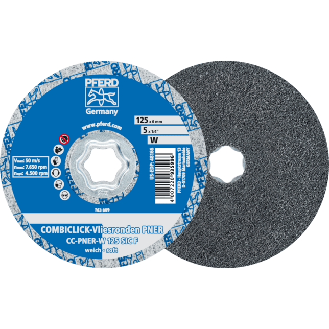 Systém COMBICLICK sa skladá z špeciálne vyvinutého podložného disku a robustného montážneho systému na zadnej strane náradia. S podložným diskom môžu byť nástroje COMBICLICK používané na komerčne dostupných uhlových brúskach. Jedinečná geometria chladiacich otvorov zabezpečuje vysoký prietok vzduchu, čo výrazne znižuje tepelnú záťaž na abrazívny materiál a obrobok. V porovnaní s konvenčnými nástrojmi dosahuje rýchloupínací systém, robustný držiak, bezpečnostný zámok náradia a integrovaný chladiaci systém spolu teplotu obrobku, ktorá je o 30 % nižšia, o 25 % vyššiu rýchlosť odstraňovania materiálu, o 30 % dlhšiu životnosť náradia a lepšie využitie abrazívneho materiálu. Tento dizajn je ideálny na dosiahnutie veľmi jemného, rovnomerného povrchového dokončenia, ktoré, v závislosti od požiadaviek, predstavuje dostatočnú prípravu na vysokolesklé leštenie. Je obzvlášť vhodný na prácu na väčších plochách komponentov vyrobených z nehrdzavejúcej ocele (INOX).