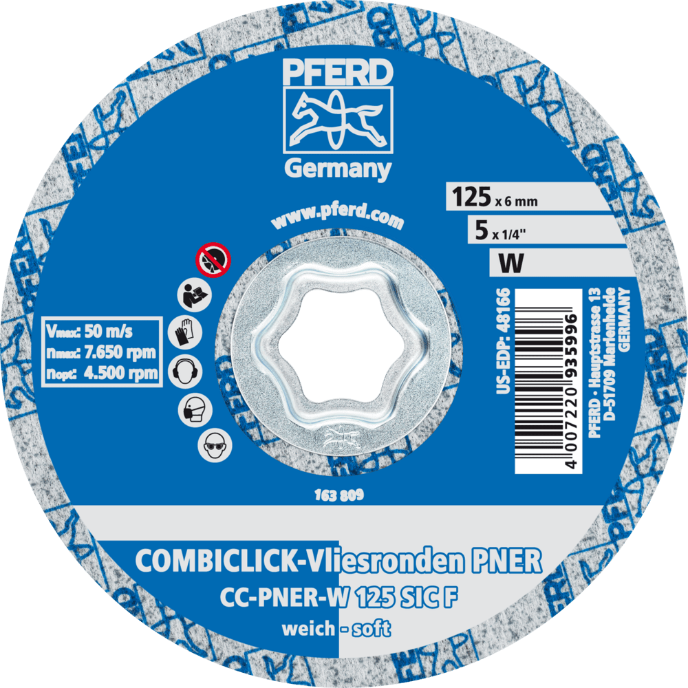 Systém COMBICLICK pozostáva z osobitne vyvinutého podložného disku a robustného montážneho systému na zadnej strane náradia. S podložným diskom môžu byť náradia COMBICLICK používané na komerčne dostupných uhlových brúskach. Jedinečná geometria chladenia zabezpečuje vysoký prietok vzduchu, čo výrazne znižuje tepelnú záťaž na abrazívny materiál a obrobok. V porovnaní s konvenčnými náradiami dosahuje rýchlomontážny systém, robustný držiak, bezpečnostný zámok náradia a integrovaný chladicí systém spolu teplotu obrobku, ktorá je o 30 % nižšia, o 25 % vyššiu rýchlosť odstraňovania materiálu, o 30 % dlhšiu životnosť náradia a lepšie využitie abrazívneho materiálu. Tento dizajn je ideálny na dosiahnutie veľmi jemného, rovnomerného povrchového dokončenia, ktoré, v závislosti od požiadaviek, predstavuje dostatočnú prípravu na vysokolesklé leštenie. Je obzvlášť vhodný na prácu na väčších plochách komponentov vyrobených z nehrdzavejúcej ocele (INOX).
