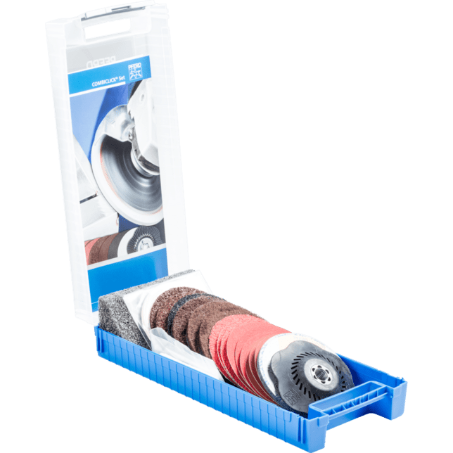 Systém COMBICLICK pozostáva z špeciálne vyvinutého podložného disku a robustného montážneho systému na zadnej strane náradia. S podložným diskom môžu byť náradia COMBICLICK používané na komerčne dostupných uhlových brúskach. Jedinečná geometria chladiacich otvorov zabezpečuje vysoký prietok vzduchu, čo výrazne znižuje tepelnú záťaž na abrazívny materiál a obrobok. V porovnaní s konvenčnými náradiami dosahuje rýchlomontážny systém, robustný držiak, bezpečnostný zámok náradia a integrovaný chladiaci systém spolu teplotu obrobku, ktorá je o 30 % nižšia, o 25 % vyššiu rýchlosť odstraňovania materiálu, o 30 % dlhšiu životnosť náradia a lepšie využitie abrazívneho materiálu. Sada na prácu na povrchoch, od hrubého po zrkadlový lesk. Skladá sa z abrazívnych diskov COMBICLICK, netkaných diskov, filcových diskov, podložných diskov a vhodnej leštiacej pasty. Univerzálna leštiaca pasta je dostupná iba v sade a nie samostatne.