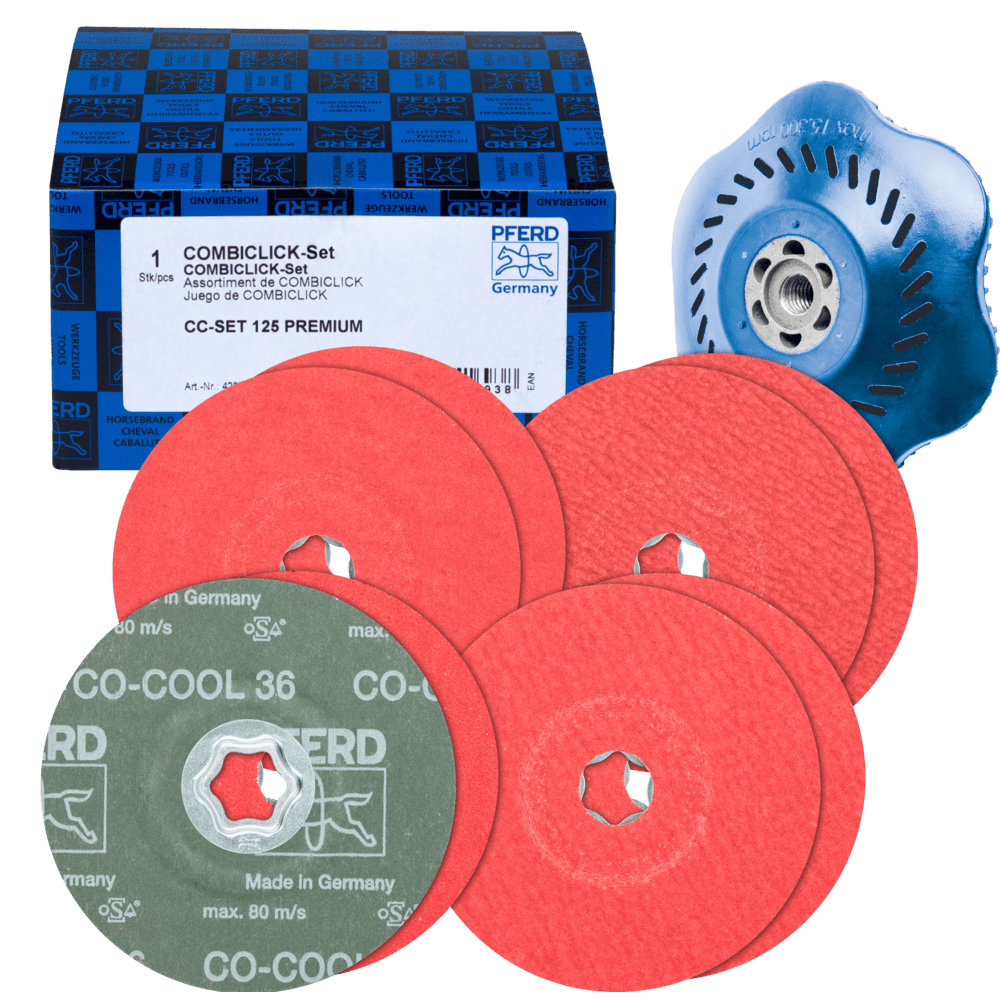 Systém COMBICLICK pozostáva z špeciálne vyvinutého podložného disku a robustného montážneho systému na zadnej strane náradia. S podložným diskom môžu byť náradia COMBICLICK používané na komerčne dostupných uhlových brúskach. Jedinečná geometria chladenia zabezpečuje vysoký prietok vzduchu, čo výrazne znižuje tepelnú záťaž na abrazívny materiál a obrobok. V porovnaní s konvenčnými náradiami dosahuje rýchloupínací systém, robustný držiak, bezpečnostný zámok náradia a integrovaný chladicí systém spolu teplotu obrobku, ktorá je o 30 % nižšia, o 25 % vyššiu rýchlosť odstraňovania materiálu, o 30 % dlhšiu životnosť náradia a lepšie využitie abrazívneho materiálu. Sada PFERD TOOLS COMBICLICK na agresívne brúsenie s maximálnou rýchlosťou odstraňovania materiálu na tvrdých materiáloch, ktoré zle vedú teplo. Konzistentne vysoký výkon vďaka samoostriacemu keramickému oxidu. Aktívne brúsiace prísady v povlaku podstatne zlepšujú rýchlosť odstraňovania materiálu, zabraňujú upchávaniu a vedú k chladnejšiemu brúsení. Sada s priemerom 125 mm je obzvlášť flexibilná okolo okrajov.