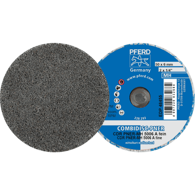 - Používajte COMBIDISC netkané kotúče s držiakom abrazívneho kotúča na flexibilných hriadeľových pohonoch s uhlovým rukoväťou alebo malými uhlovými brúskami na stlačený vzduch alebo elektrickými.
