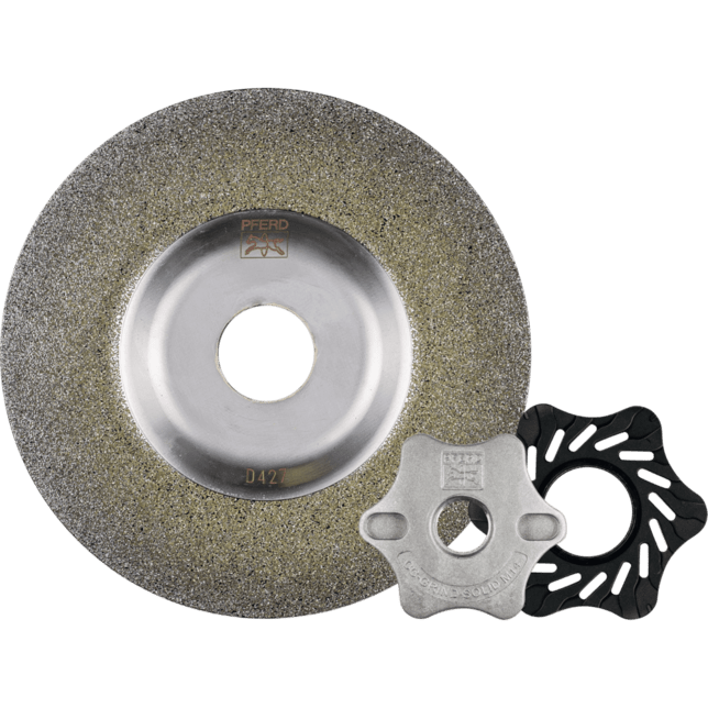 CC-GRIND SOLID-DIAMOND bol špeciálne vyvinutý pre aplikácie na tvrdých materiáloch, ktoré nie je možné obrábať konvenčnými nástrojmi vyrobenými z oxidu hliníka alebo karbidu kremíka. CC-GRIND SOLID DIAMOND sa používa na mokré aj suché brúsenie. Súprava zodpovedajúcej upínacej príruby (s závitom M14) je súčasťou dodávky.