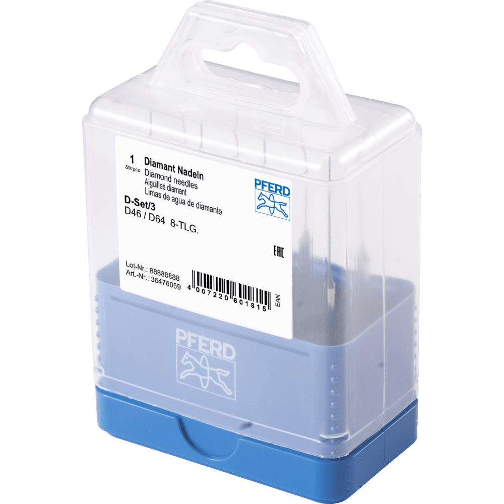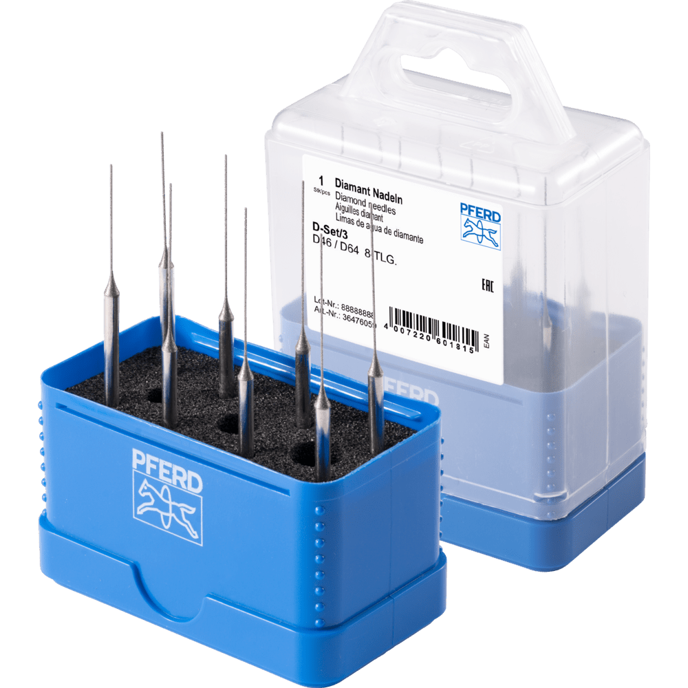Súprava obsahuje 8 diamantových ihiel, rozdelených do štyroch párov. Pevná plastová krabička chráni náradie pred špinou a poškodením.