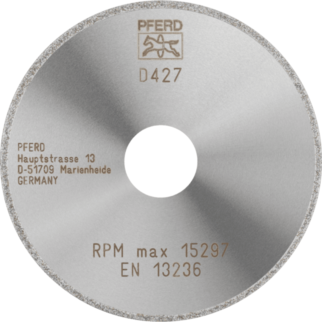 - Odporúčania na použitie: Hrubá veľkosť zrna D 427 je vhodná na rezanie predsinterovanej keramiky a na orezávanie a rezanie plastov vystužených vláknami (GRP/CRP) na požadovanú veľkosť.