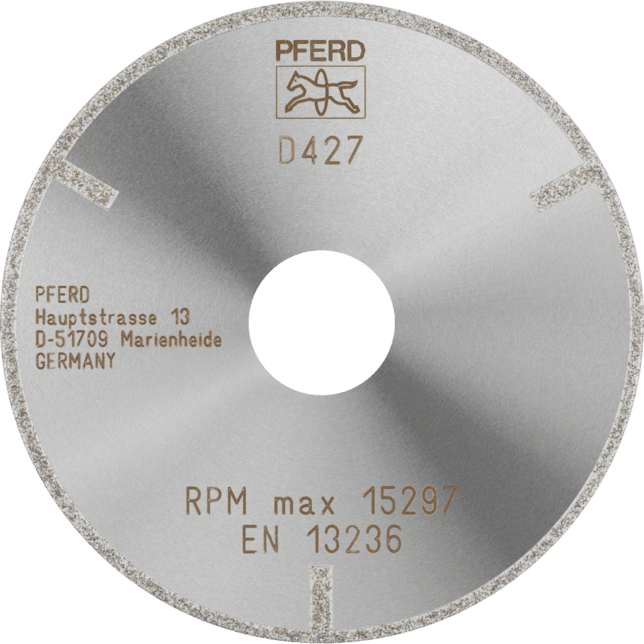 - Odporúčania na použitie: Hrubá veľkosť zrna D 427 je vhodná na rezanie predzlisovaných keramík a na orezávanie a rezanie plastov vystužených vláknami (GRP/CRP) na požadovanú veľkosť.