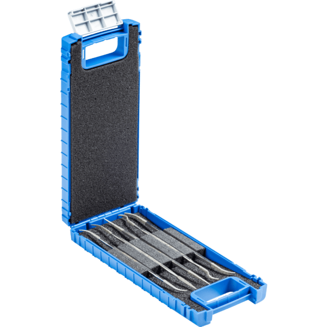 Sada diamantových riflovacích pilníkov je dodávaná v robustnej, praktickej plastovej krabici, ktorá chráni náradie pred poškodením. To je ideálne na uchovávanie v náradí alebo na pracovnom stole. Diamantové riflovacie pilníky sa používajú na prácu v ťažko prístupných oblastiach a na zložitých geometriách. Dĺžka povlaku je 25 mm na každej strane pilníkov. Sada obsahuje jeden z každého z nasledujúcich profilov pilníkov: krížový ovál, ručný, DF 20 (štvorcový), DF 22 (trojštvorcový), DF 24 (guľatý)