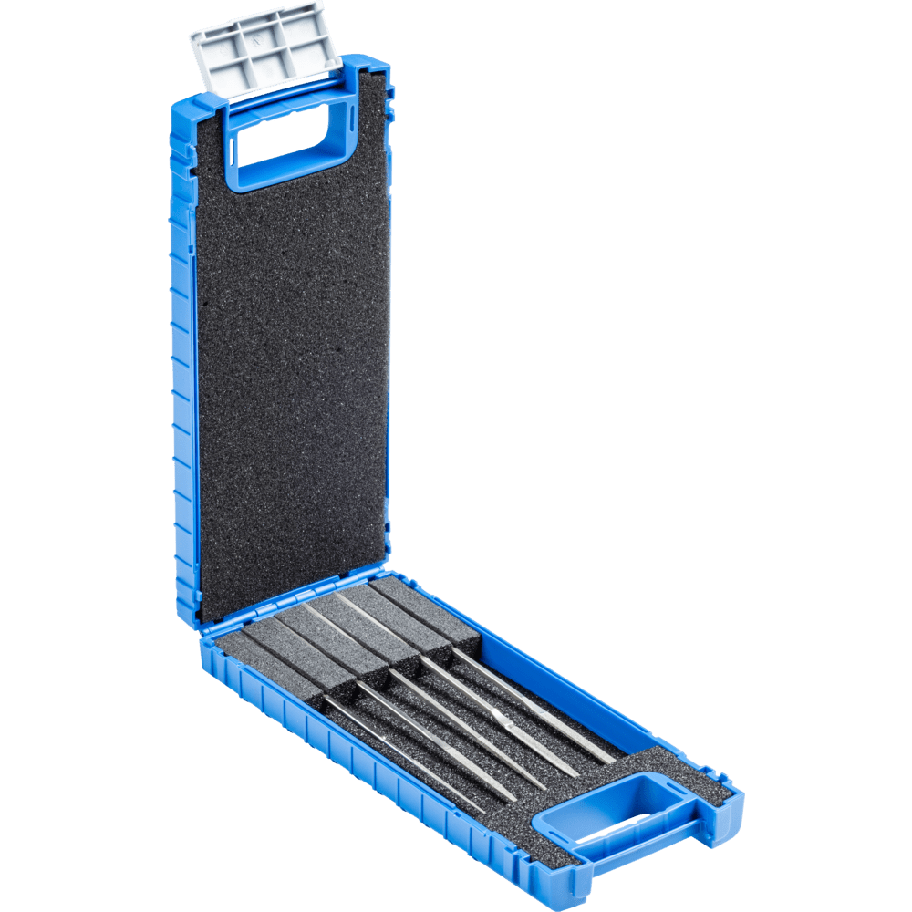 Súprava diamantových únikového pilníkov je dodávaná v robustnej, praktickej plastovej krabici, ktorá chráni náradie pred poškodením. To je ideálne na uchovávanie v náradí alebo na pracovnom stole. Diamantové únikové pilníky sa používajú na veľmi malé tvary pri výrobe nástrojov a presnej mechanike. Majú kovanú stopku, ktorá umožňuje použitie bez ďalšej rukoväte. Súprava obsahuje jeden z každého z nasledujúcich profilov pilníkov: polokruhový, trojuholníkový, ručný, štvorcový a okrúhly.
