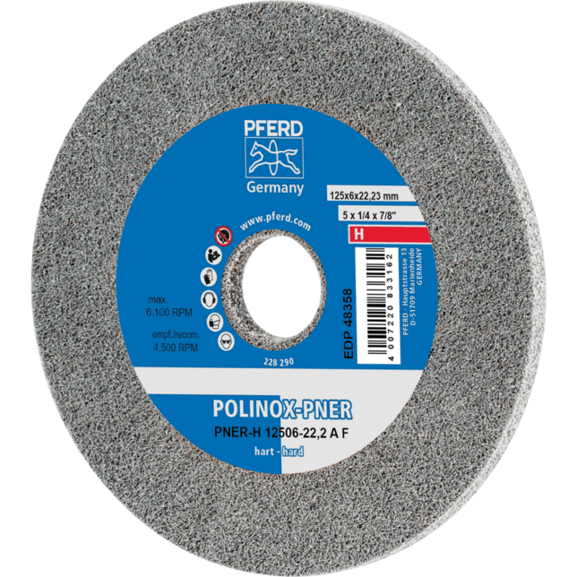 POLINOX jednotné kotúče PNER sa skladajú z viacerých silne stlačených, netkaných vrstiev, ktoré sú spojené špeciálnym systémom zrna/živice. Rôzne kombinácie stlačenia, vlákien, zrna a vhodného spojiva vedú k netkaným produktom, ktoré ponúkajú veľmi dobrý povrchový finish, vysokú rýchlosť odstraňovania materiálu a dlhú životnosť nástroja. Tieto nástroje sa dajú použiť na široké spektrum prác na povrchoch, od relatívne hrubého brúsenia po prípravu povrchu na leštenie. Verzia pre uhlové brúsky a brúsky na rohové zvarové spoje je obzvlášť vhodná na prácu na rohových zvaroch a ťažko prístupných štrbinách a preliačinách. Tvrdá verzia s veľmi vysokou rýchlosťou odstraňovania materiálu, dobrou pevnosťou hrán a dlhou životnosťou nástroja pre náročné aplikácie odhrotovania a leštenia.