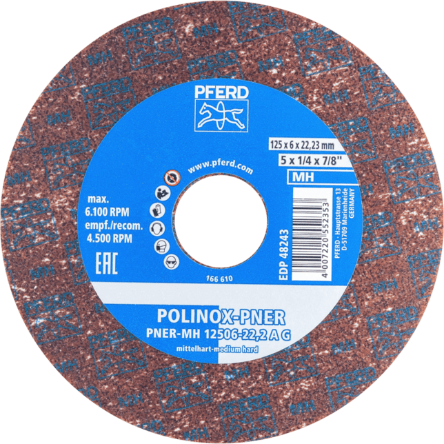POLINOX jednotné kotúče PNER sa skladajú z viacerých silne stlačených, netkaných vrstiev, ktoré sú spojené špeciálnym systémom zrna/živice. Rôzne kombinácie stlačenia, vlákien, zrna a vhodného spojiva vedú k netkaným produktom, ktoré ponúkajú veľmi dobré povrchové úpravy, vysokú rýchlosť odstraňovania materiálu a dlhú životnosť nástroja. Tieto nástroje sa dajú použiť na široké spektrum prác na povrchoch, od relatívne hrubého brúsenia po prípravu povrchu na leštenie. Verzia pre uhlové brúsky a brúsky na zvarové švy je obzvlášť vhodná na prácu so zvarovými švami a ťažko prístupnými škárami a prehlbovaniami. Stredne tvrdá verzia s vyššou pevnosťou hrany a životnosťou nástroja pre hrubé odhrotovanie a čistiace aplikácie.