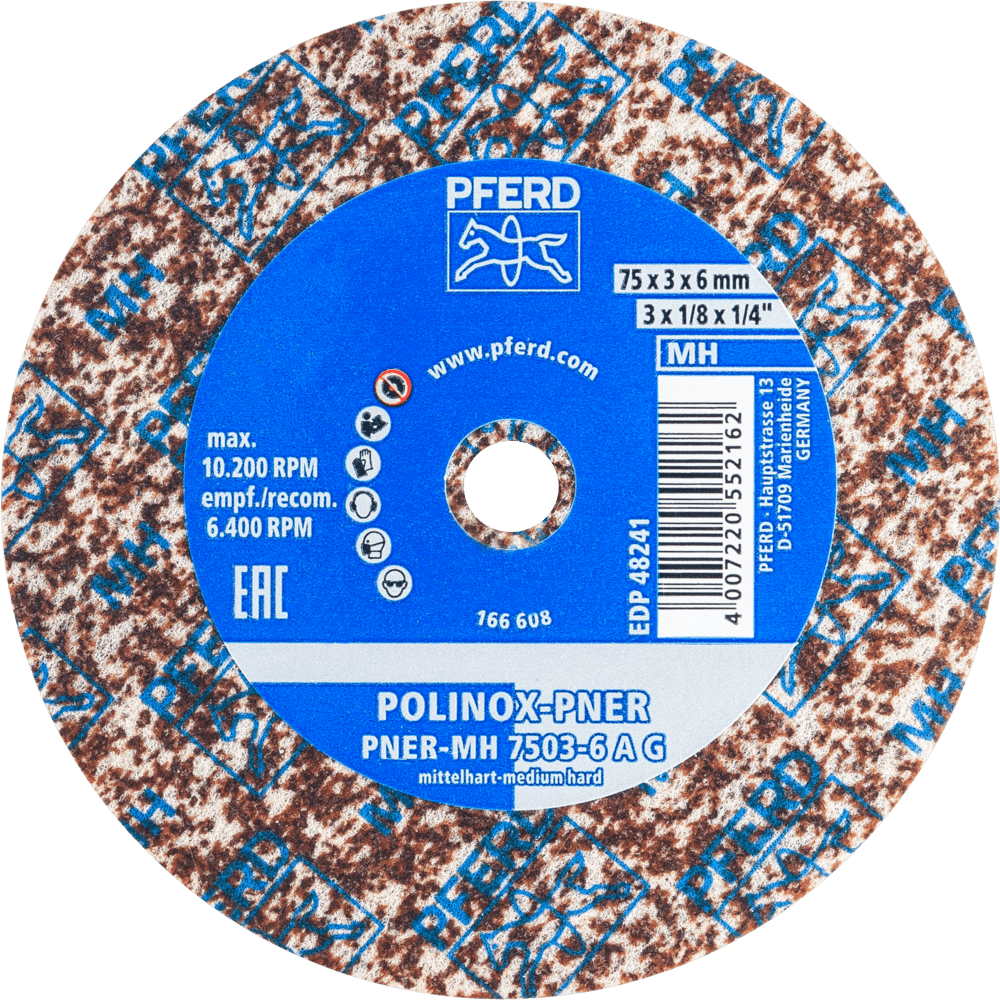 POLINOX jednotné kotúče PNER sa skladajú z viacerých silne stlačených, netkaných vrstiev, ktoré sú spojené špeciálnym systémom zrna/živice. Rôzne kombinácie stlačenia, vlákien, zrna a vhodného spojiva vedú k netkaným produktom, ktoré ponúkajú veľmi dobrý povrchový finish, vysokú rýchlosť odstraňovania materiálu a dlhú životnosť nástroja. Tieto nástroje sa dajú použiť na širokú škálu prác na povrchoch, od relatívne hrubého brúsenia po prípravu povrchu na leštenie. Verzia pre priame brúsky, flexibilné hriadele a stolné brúsky je obzvlášť vhodná na prácu na menších povrchoch. Stredne tvrdá verzia s vyššou pevnosťou hrany a životnosťou nástroja pre hrubé odhrotovanie a čistiace aplikácie.