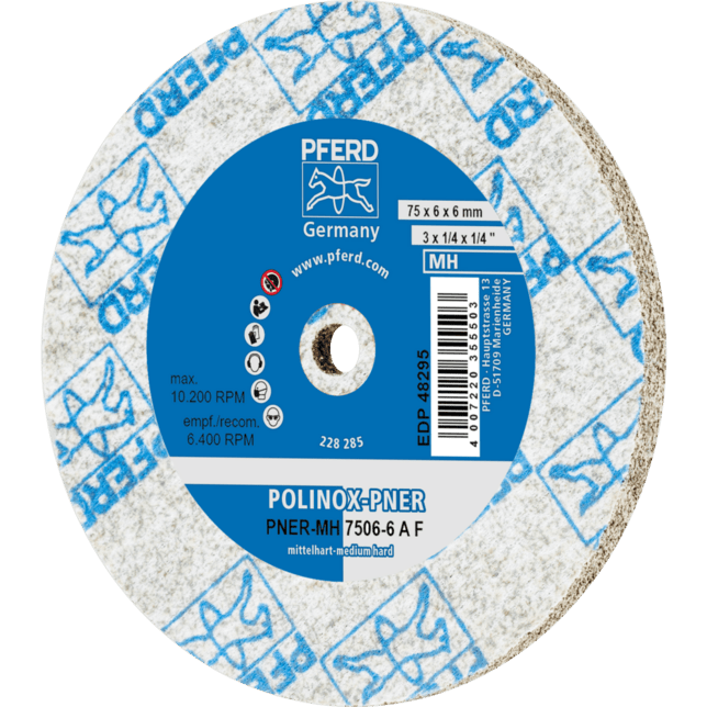 POLINOX jednotné kotúče PNER sa skladajú z viacerých silne stlačených, netkaných vrstiev, ktoré sú spojené špeciálnym systémom zrna/živice. Rôzne kombinácie stlačenia, vlákien, zrna a vhodného spojiva vedú k netkaným produktom, ktoré ponúkajú veľmi dobrý povrchový finiš, vysokú rýchlosť odstraňovania materiálu a dlhú životnosť nástroja. Tieto nástroje sa dajú použiť na široké spektrum prác na povrchoch, od relatívne hrubého brúsenia po prípravu povrchu na leštenie. Verzia pre priame brúsky, flexibilné hriadele a stolové brúsky je obzvlášť vhodná na prácu na menších povrchoch. Stredne tvrdá verzia s zvýšenou pevnosťou hrany a životnosťou nástroja pre hrubé odhrotovanie a čistiace aplikácie.