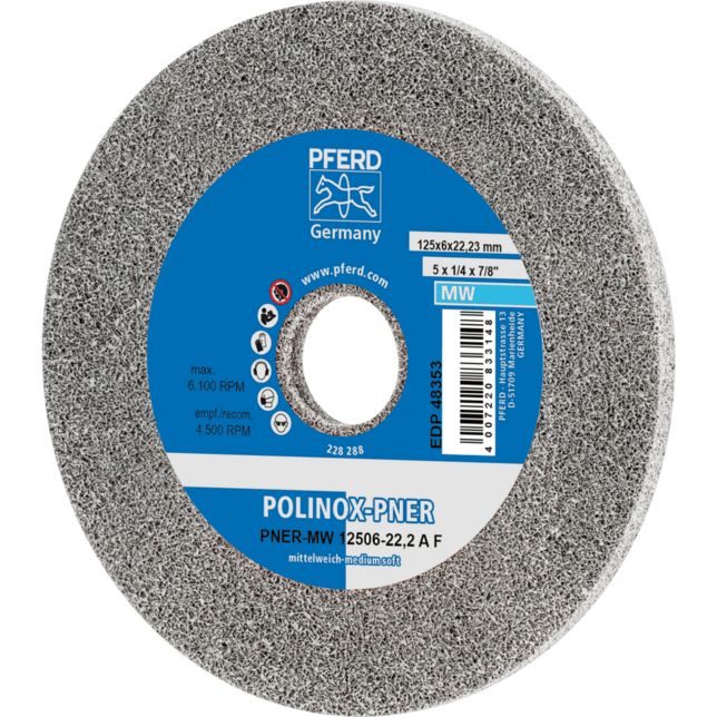 POLINOX jednotné kotúče PNER sa skladajú z viacerých silne stlačených, netkaných vrstiev, ktoré sú spojené špeciálnym systémom zrna/živice. Rôzne kombinácie stlačenia, vlákien, zrna a vhodného spojiva vedú k netkaným produktom, ktoré ponúkajú veľmi dobrý povrchový finiš, vysokú rýchlosť odstraňovania materiálu a dlhú životnosť nástroja. Tieto nástroje sa dajú použiť na široké spektrum prác na povrchoch, od relatívne hrubého brúsenia po prípravu povrchu na leštenie. Verzia pre uhlové brúsky a brúsky na rohové zvarové spoje je obzvlášť vhodná na prácu na rohových zvaroch a ťažko prístupných štrbinách a preliačinách. Stredne tvrdá verzia s vyššou pevnosťou hrany a životnosťou nástroja pre hrubé mletie a leštenie. Dobré pre prácu na hranách.