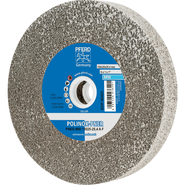 POLINOX jednotné kotúče PNER sa skladajú z viacerých silne stlačených, netkaných vrstiev, ktoré sú spojené špeciálnym systémom zrna/živice. Rôzne kombinácie stlačenia, vlákien, zrna a vhodného spojiva vedú k netkaným produktom, ktoré ponúkajú veľmi dobrý povrchový finish, vysokú rýchlosť odstraňovania materiálu a dlhú životnosť nástroja. Tieto nástroje sa dajú použiť na široké spektrum prác na povrchoch, od relatívne hrubého brúsenia po prípravu povrchu na leštenie. Verzia pre priame brúsky, flexibilné hriadele a stolové brúsky je obzvlášť vhodná na prácu na menších povrchoch. Stredne tvrdá verzia s vyššou pevnosťou hrany a životnosťou nástroja pre hrubé mletie a leštenie. Dobré na prácu na hranách. Adaptér je súčasťou kotúčov s priemerom 150 x 25 mm, ktorý umožňuje zmenšiť priemer stredového otvoru z 25,4 mm na 20 mm.