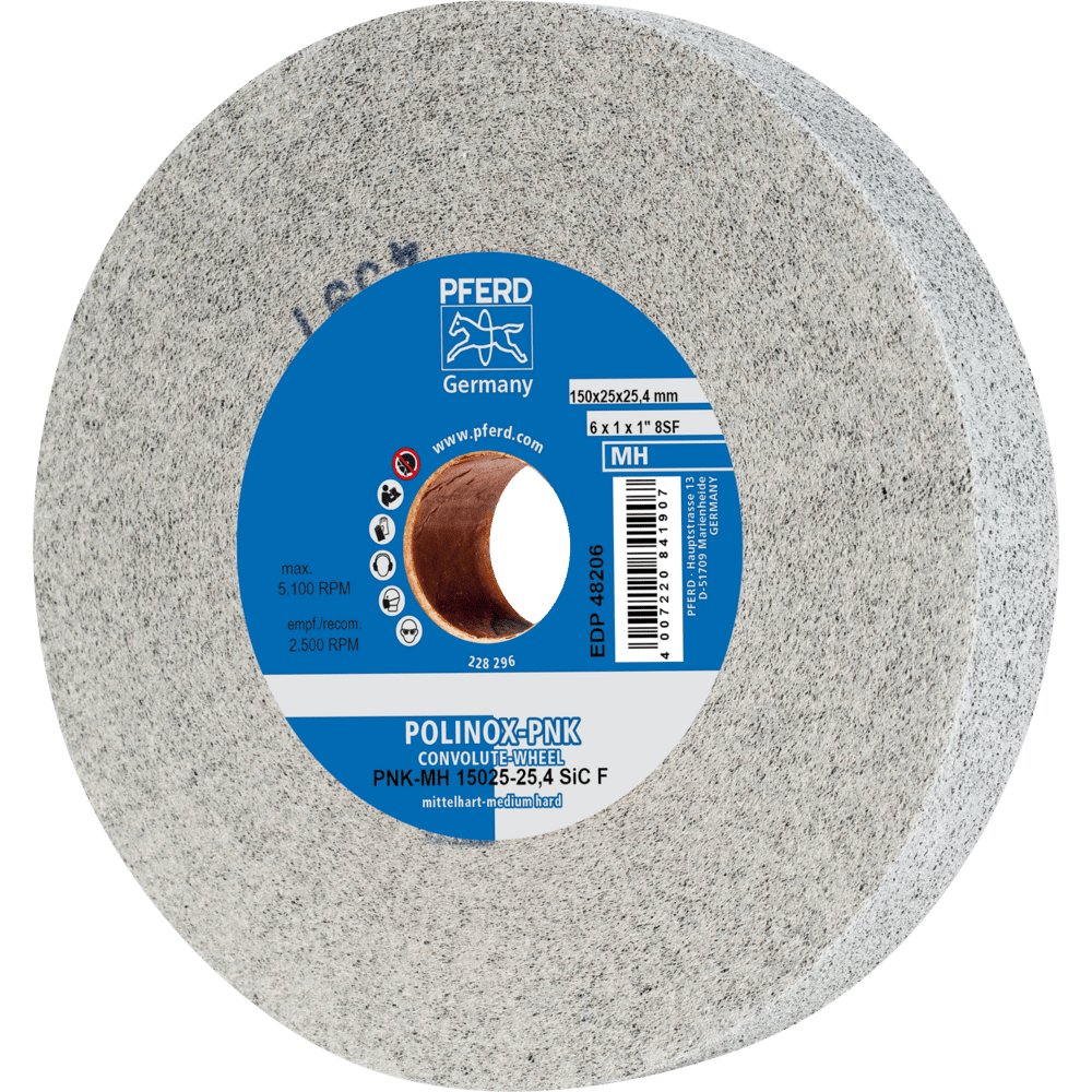 POLINOX konvolútne kotúče PNK vytvárajú matné povrchové úpravy. POLINOX konvolútne kotúče PNK pozostávajú z spirálovito tvarovaného, netkaného abrazíva, ktoré je navinuté okolo jadra a napenené. Pena podporuje netkanú zložku a pozitívne ovplyvňuje jej životnosť a abrazívny výkon. Tento konkrétny spoj vytvára netkané kotúče s veľmi dobrou povrchovou úpravou, vysokou rýchlosťou odstraňovania materiálu a dlhou životnosťou nástroja. Tieto vlastnosti sú obzvlášť zjavné pri odhrotovaní, miešaní, dokončovaní a leštení mäkkých kovov, zliatin a vysoko zliatinových oceľí, ako aj titánových zliatin. Kotúče je možné používať na stacionárnych strojoch a brúsnych strojoch, ako aj na prenosných pohonoch, ako sú priame brúsky. Úpravou kotúčov je možné prispôsobiť ich geometriu špeciálnym pracovným kusom. Stredne tvrdá verzia s zvýšenou pevnosťou hrán a životnosťou nástroja pre hrubé odhrotovanie a odhrotovanie, miešanie a čistenie prác.