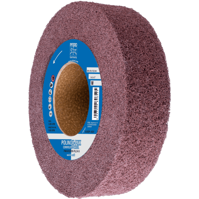 POLINOX konvolútne kotúče PNK vytvárajú matné povrchové úpravy. POLINOX konvolútne kotúče PNK pozostávajú z spirálovito tvarovaného, netkaného abrazíva, ktoré je navinuté okolo jadra a napenené. Pena podporuje netkanú zložku a pozitívne ovplyvňuje jej životnosť a abrazívny výkon. Tento konkrétny spoj vytvára netkané kotúče s veľmi dobrou povrchovou úpravou, vysokou rýchlosťou odstraňovania materiálu a dlhou životnosťou nástroja. Tieto vlastnosti sú obzvlášť zjavné pri odhrotovaní, zjednocovaní, dokončovaní a leštení mäkkých kovov, zliatin a vysoko zliatinových oceľí, ako aj titánových zliatin. Kotúče môžu byť použité na stacionárnych strojoch a brúsnych strojoch, ako aj na prenosných pohonoch, ako sú priame brúsky. Úpravou kotúčov ich možno prispôsobiť aj geometrii špeciálnych obrobkov. Mäkká verzia s veľmi dobrým abrazívnym výkonom na kontúrach. Veľmi dobré na zjednocovanie povrchov.
