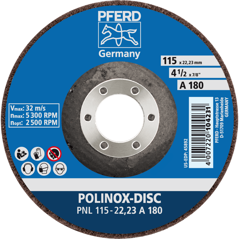POLINOX brúsne kotúče pozostávajú z netkanej polyamidovej abrazívnej hmoty, do ktorej je integrovaný abrazívny zrn. Netkané abrazívne lamely sú prilepené na podložku z sklenenej tkaniny, čo znamená, že kotúče môžu byť použité na prácu obrátené nadol. Dlhá životnosť náradia je dosiahnutá hustým usporiadaním lamiel. Náradie je navrhnuté na prácu na veľkých plochách s rýchlosťou nastaviteľnými uhlovými brúskami.