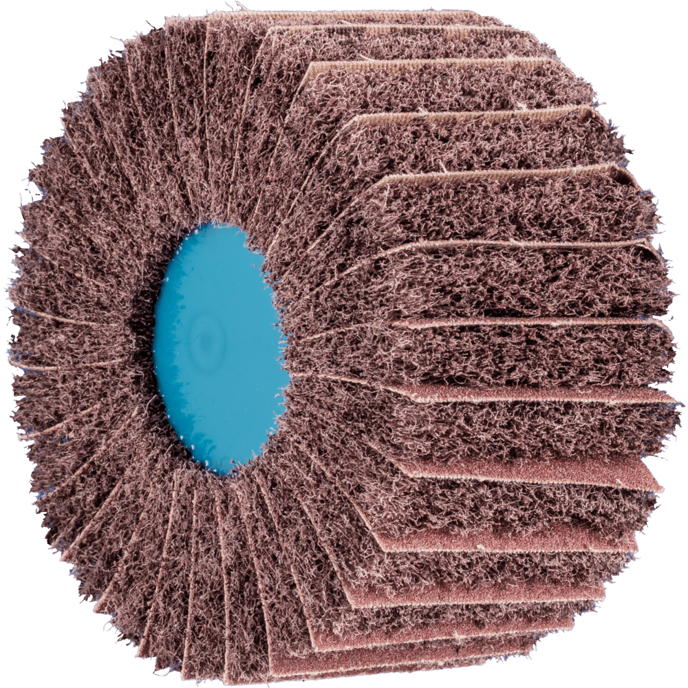 POLINOX neosadené brúsne kotúče pozostávajú z netkanej polyamidovej abrazívnej hmoty, do ktorej je integrovaný abrazívny zrn. Netkaný abrazívny materiál je usporiadaný v niekoľkých radiálnych chlopniach, s abrazívnymi tkaninovými medziľahlými vrstvami. Štruktúra chlopní uľahčuje lepšie odstraňovanie materiálu a dosahuje hrubší povrchový finiš. Nástroj je navrhnutý na prácu na stredne veľkých plochách s rýchlosťou nastaviteľnými uhlovými brúskami a brúskami na zvarové švy a môže byť priamo namontovaný na vretene pohonného systému bez potreby ďalších upínacích zariadení. Tento nástroj sa najmä používa na prácu na veľkých plochách.