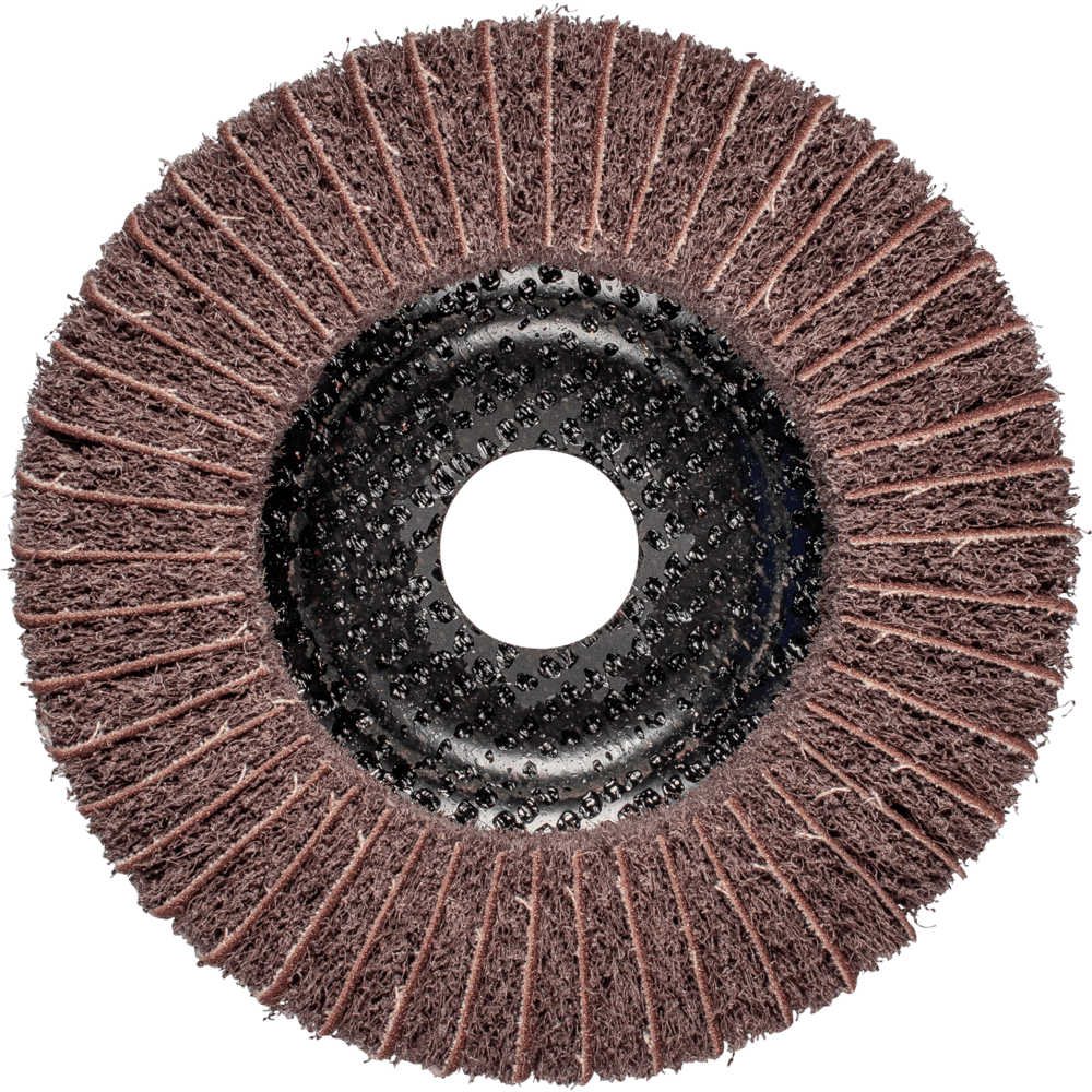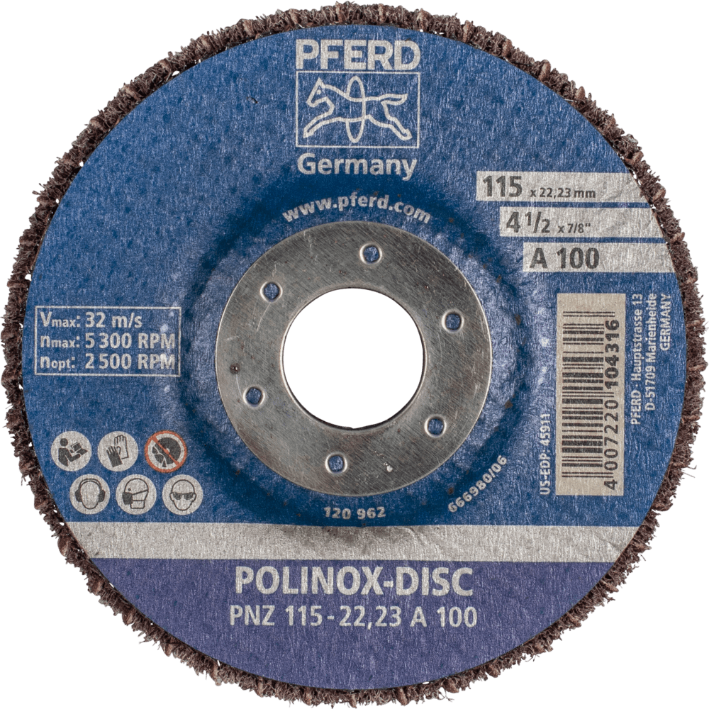 POLINOX brúsne kotúče sa skladajú z netkanej polyamidovej abrazívnej hmoty, do ktorej je integrované abrazívne zrnko. Netkané a abrazívne pláty sú prilepené na podložku z sklenenej tkaniny, čo znamená, že kotúče môžu byť používané na veľkých plochách s čelom nadol. Dlhá životnosť náradia je dosiahnutá hustým usporiadaním plátov. Náradie je navrhnuté na prácu na veľkých plochách s rýchlosťou nastaviteľnými uhlovými brúskami.