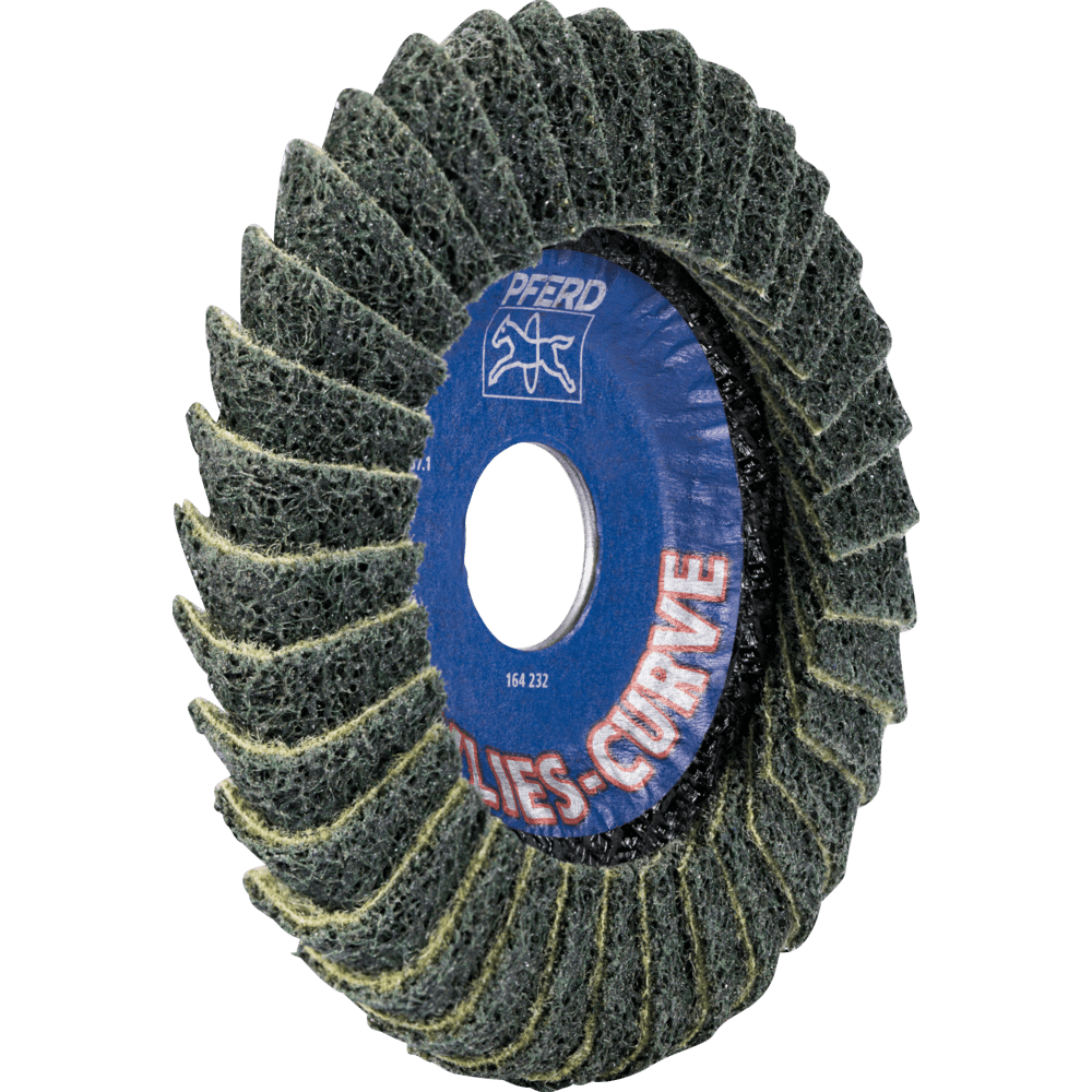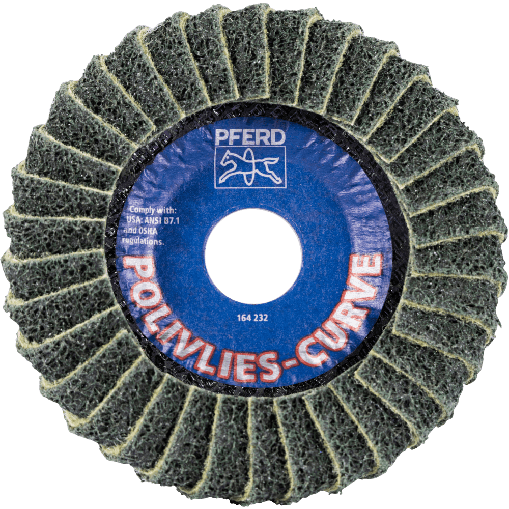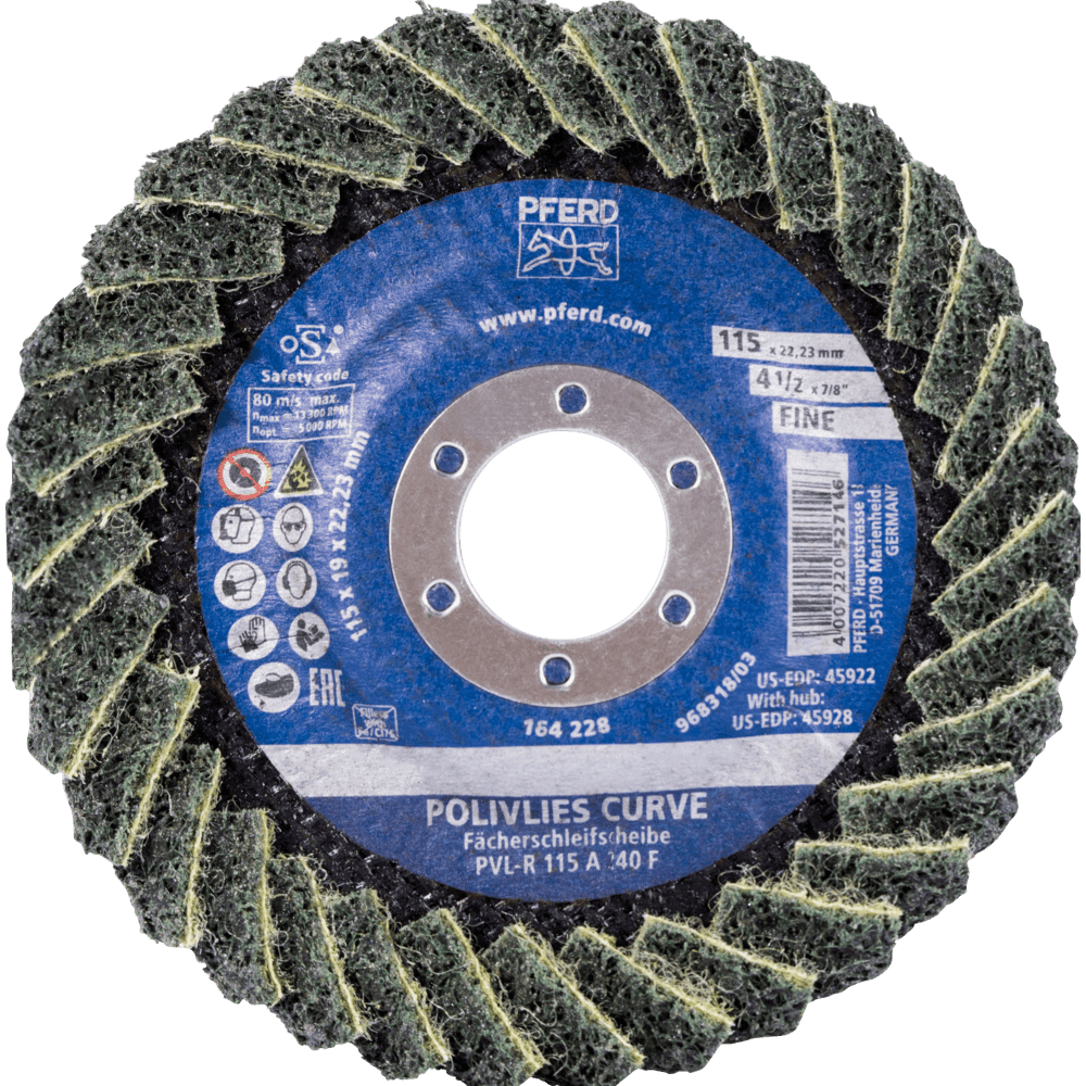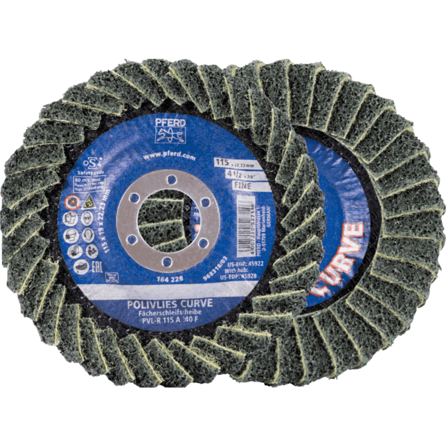 Pre všeobecné aplikácie hrubého až jemného brúsenia v priemysle a profesionálnych remeslách. Verzia Curve sa môže používať na brúsiacej strane, ako aj na zadnej strane a na rádiuse. POLIVLIES lamelový kotúč PVL-R bol špeciálne vyvinutý na prácu na rohových zvaroch. Je to jediný lamelový kotúč na svete, ktorý má lamely na brúsiacej strane, na zadnej strane a na rádiuse. Lamelový kotúč POLIVLIES PVL-R od PFERD TOOLS je patentovaný v mnohých krajinách po celom svete. POLIVLIES zrnitosť 240 F = jemná (modrá)