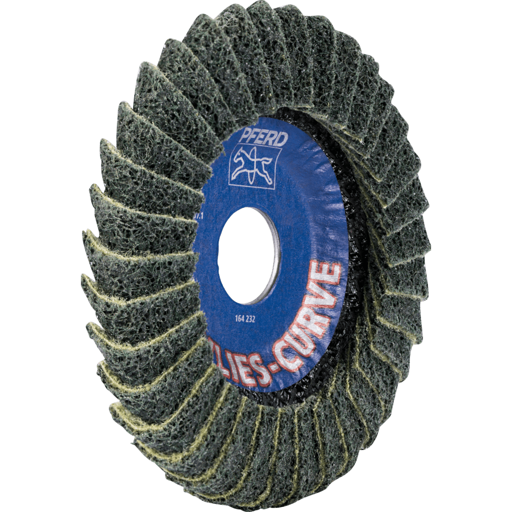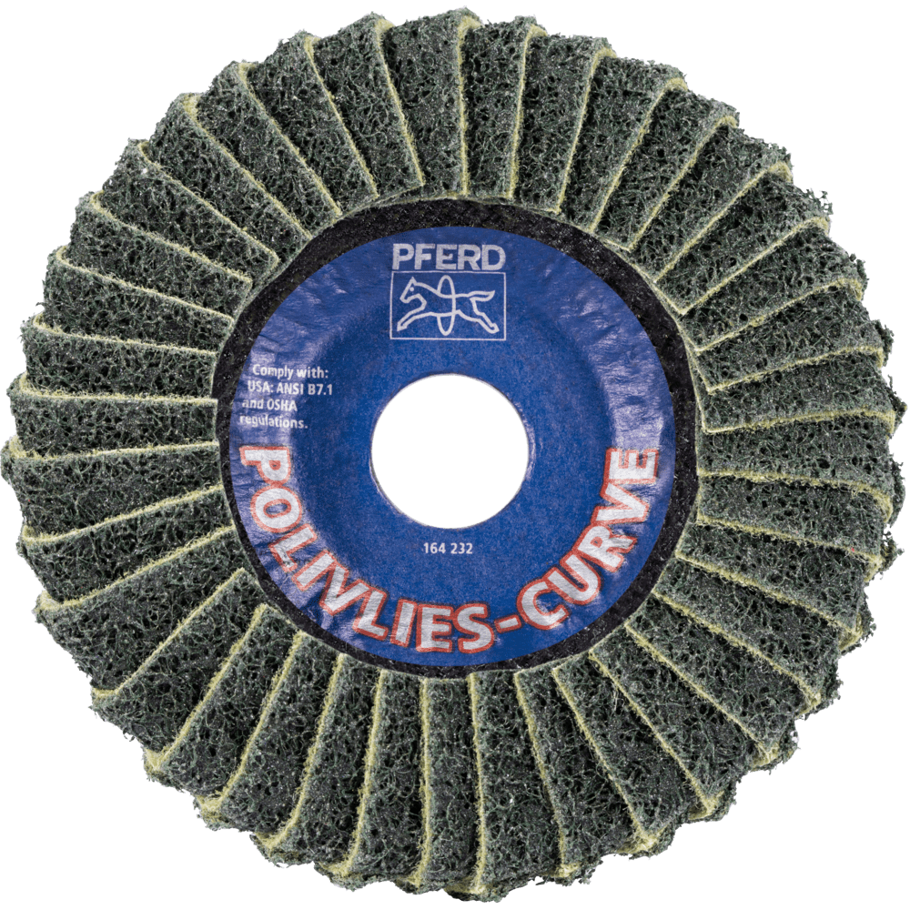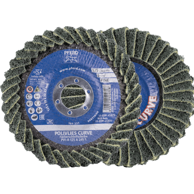 Pre všeobecné aplikácie hrubého až jemného brúsenia v priemysle a profesionálnych remeslách. Verzia Curve sa môže používať na brúsiacej strane, ako aj na zadnej strane a na rádiuse. Brúsny kotúč POLIVLIES PVL-R bol špeciálne vyvinutý na prácu na rohových zvaroch. Je to jediný brúsny kotúč na svete, ktorý má lamely na brúsiacej strane, na zadnej strane a na rádiuse. Brúsny kotúč POLIVLIES PVL-R od PFERD TOOLS je patentovaný v mnohých krajinách po celom svete. POLIVLIES zrnitosť 240 F = jemná (modrá)