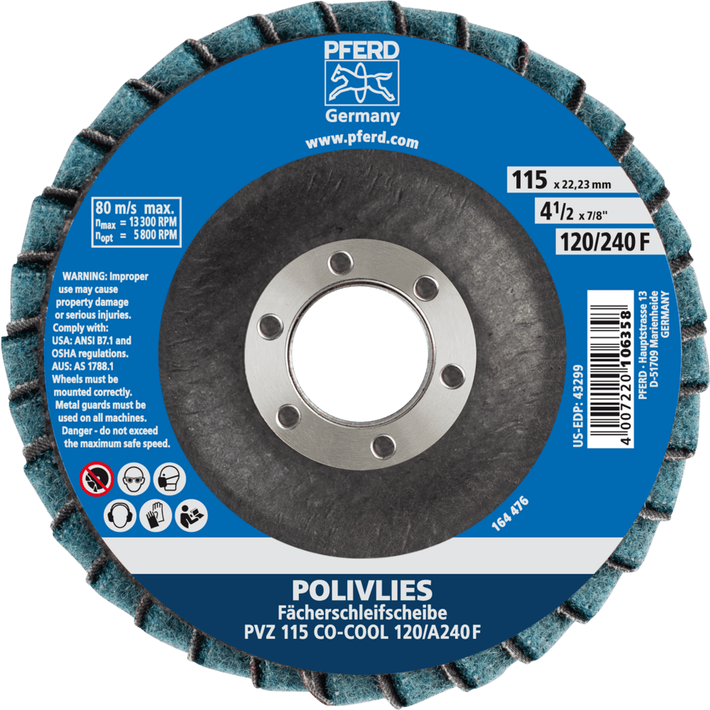 Na agresívne brúsenie s maximálnou rýchlosťou odstraňovania materiálu na tvrdých materiáloch, ktoré zle vedú teplo. Konzistentne vysoký výkon vďaka samoostriacim keramickým oxidu zrnám. Aktívne brúsiace prísady v povlaku podstatne zlepšujú rýchlosť odstraňovania materiálu, zabraňujú upchávaniu a zabezpečujú chladnejšie brúsenie. Sú obzvlášť vhodné na prácu na veľkých povrchoch z nehrdzavejúcej ocele (INOX). POLIVLIES veľkosť zrna 240 F = jemné (modré)