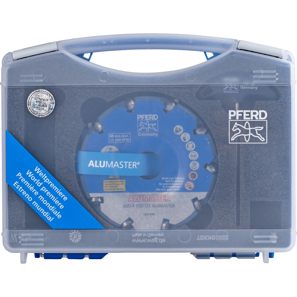 Inovatívny vysokorýchlostný disk ALUMASTER je jedinečný nástroj s extrémne vysokou rýchlosťou odstraňovania materiálu. Je ideálny na spracovanie hliníka, pretože nevytvára nebezpečný alebo výbušný prach. Nástroj pozostáva z osobitne vyvinutých karbidových rezacích vložiek, ktoré sú upevnené na vysokorýchlostnom disku. Špeciálny nástroj na spracovanie hliníkových zliatin pomocou uhlovej brúsky. Verzia HSD-F pre ploché aplikácie. Vysokorýchlostný disk ALUMASTER HSD-F 115/125 vrátane predmontovaných karbidových rezacích vložiek, šesťhranného kľúča a plastovej krabice.